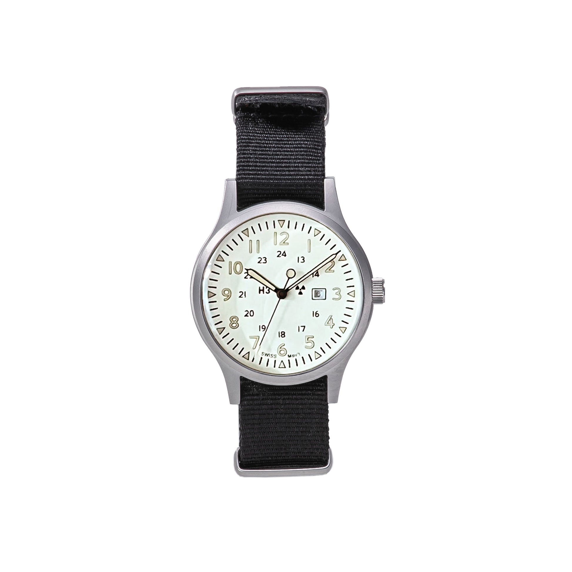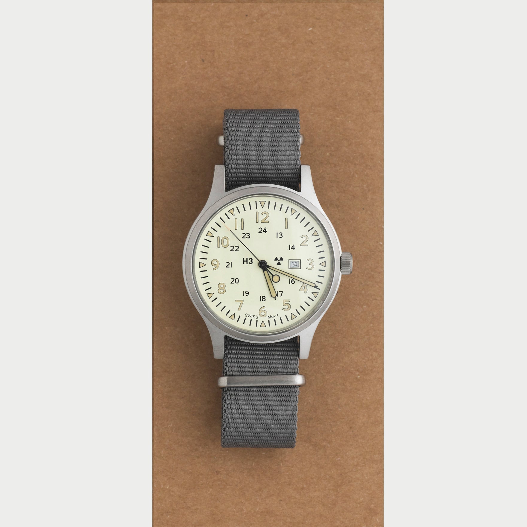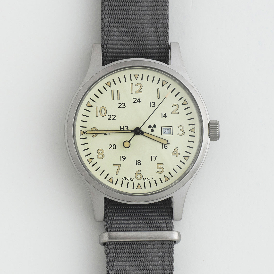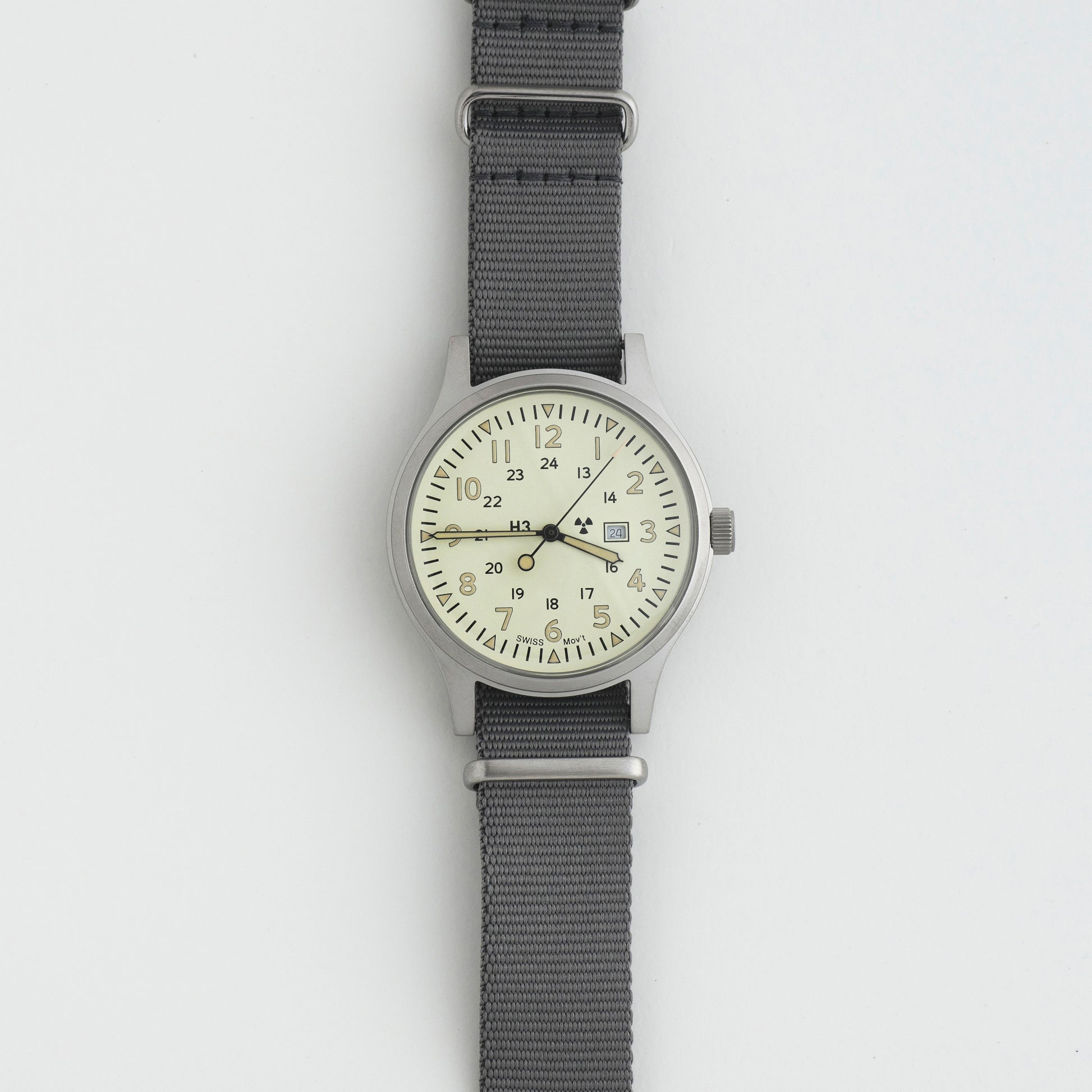 米国陸軍仕様をベースに、当時のミルスペックを忠実に再現しつつ、サイズ感をアップデートしてケース径を38ミリに拡大しました。ケース及びケースバック素材は316Lステンレススティールを採用。風防はアンティーク感を出すためにアクリル製ドーム風防を復刻。スイス製デイト付クォーツムーブメントを採用し、機能面でも現代の使用に耐えうる製品となってます。文字盤上の数字・インデックス・針の蓄光塗料にはスイス製腕時計にしか使用を許されていない「LumiNova(R)」塗料を採用し、通常のルミナスより蓄光時間・光が強化されています。加えて蓄光塗料をヴィンテージカラーを使用し、「H3」及び「 放射性物質マーク(実際には放射性物質は使用しておりません)」を追記して当時感を感じさせるデザインになっております。防水面でも5気圧防水構造ですので日常の水仕事・作業にも充分使用していただけます。