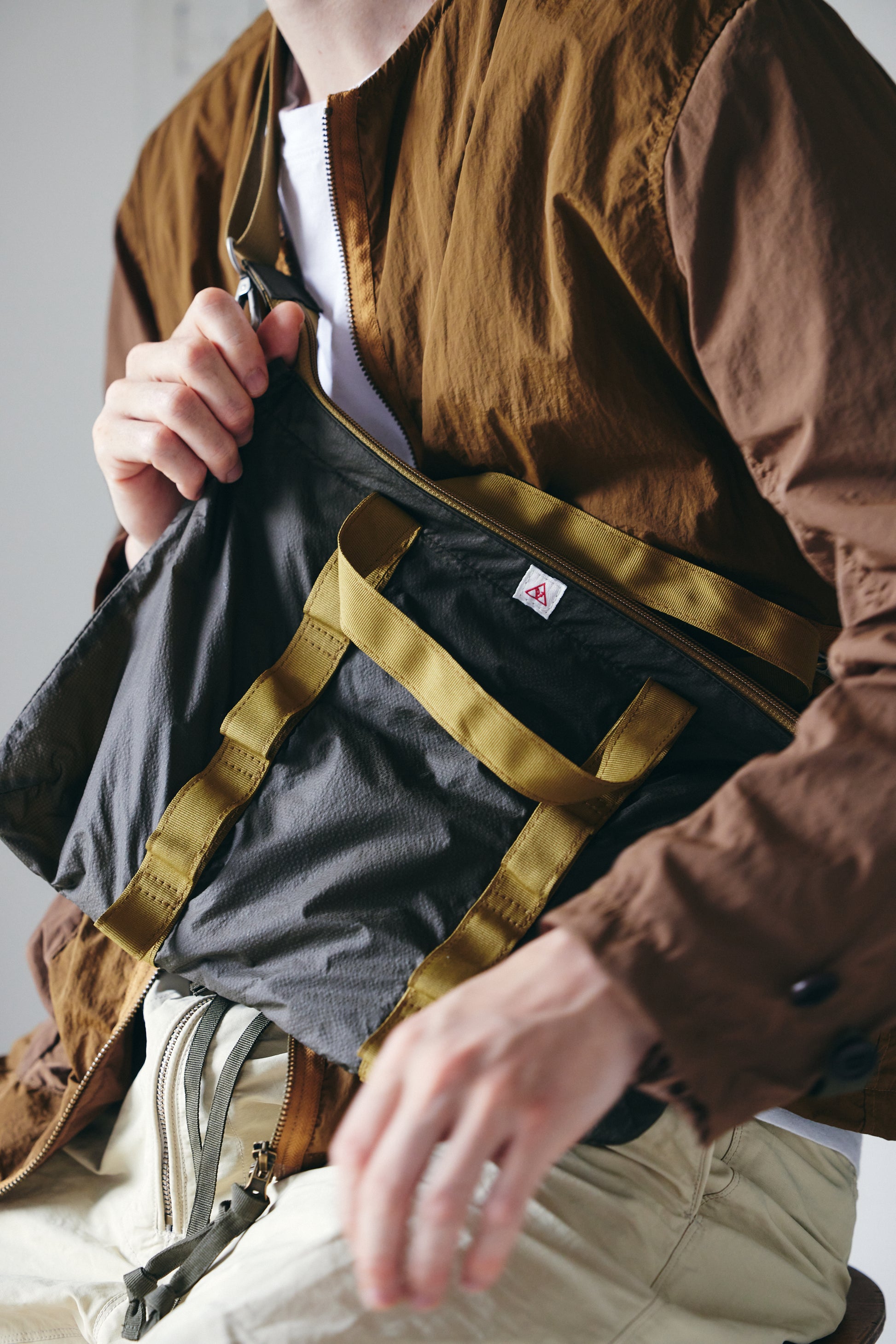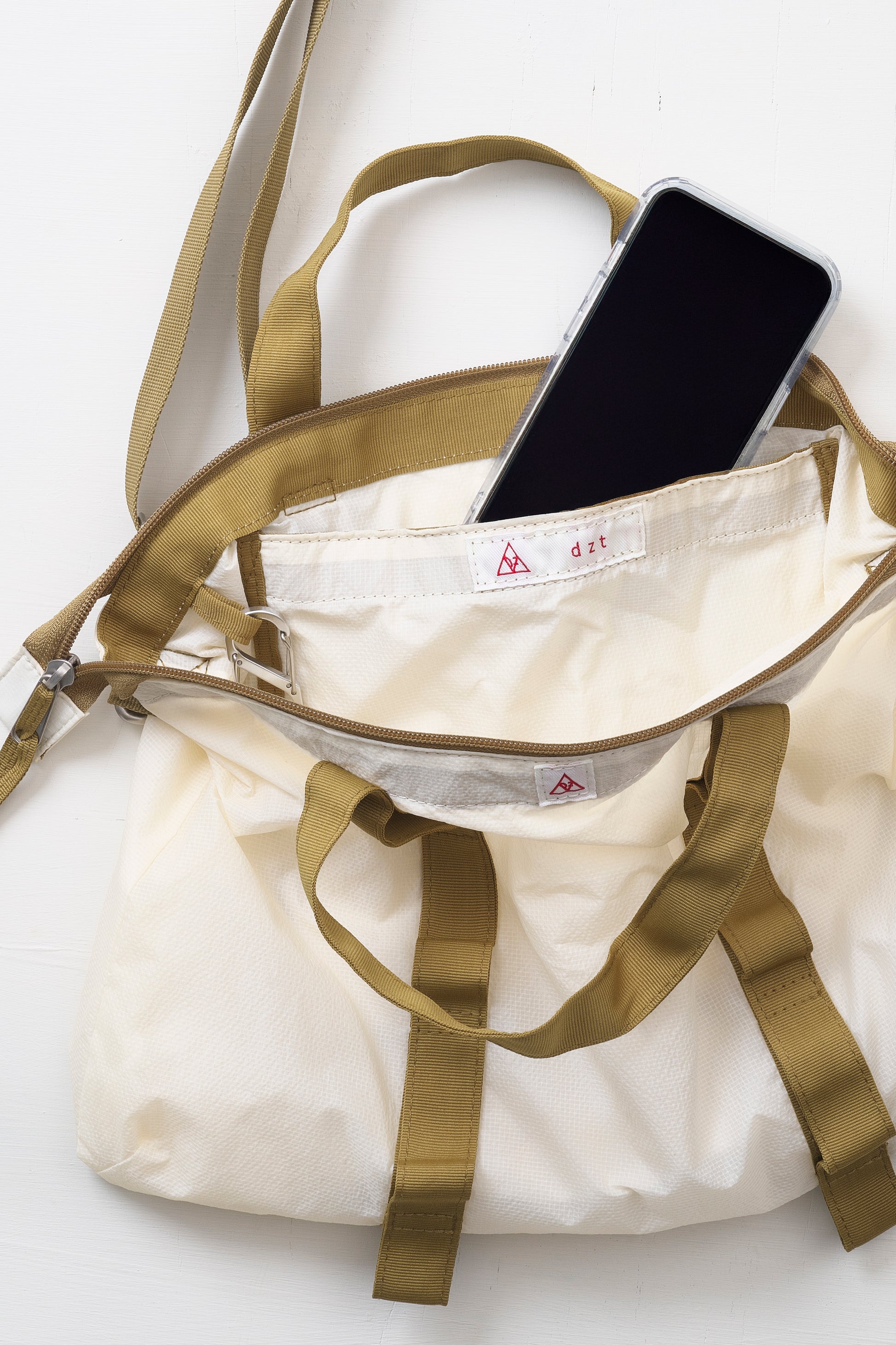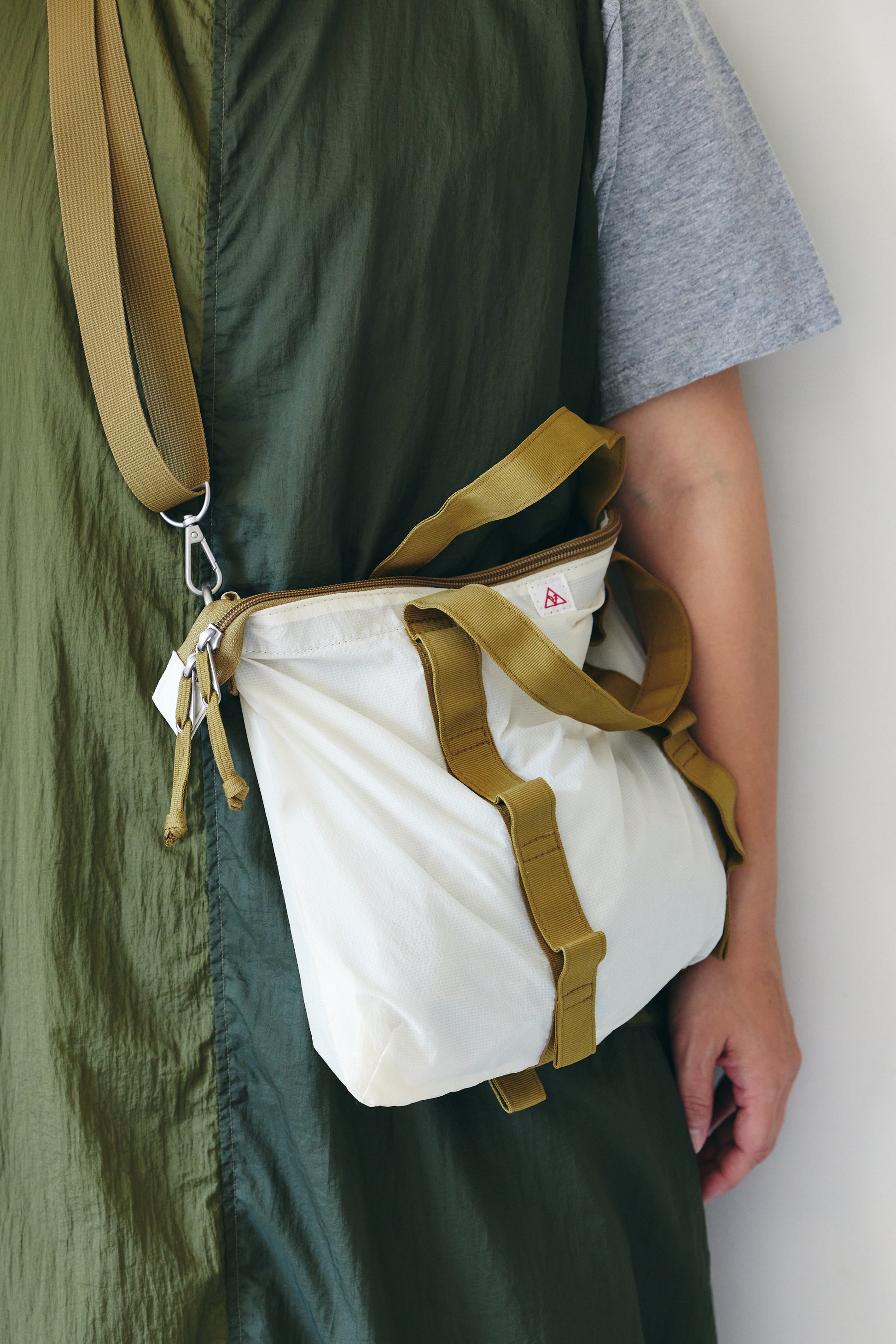 薄手のナイロン素材を二重に使用したショルダーバッグです。軽さを保ちながら、日常使いに十分な強度を確保できる素材使いをしています。通常のdztのバッグよりやや小ぶりに設定し、女性のスタイリングにも自然に馴染むサイズ感に。ユニセックスで使えるバランスですが、夏場にポケットが少なく、財布や小物の置き場に困りがちな男性にも重宝します。
