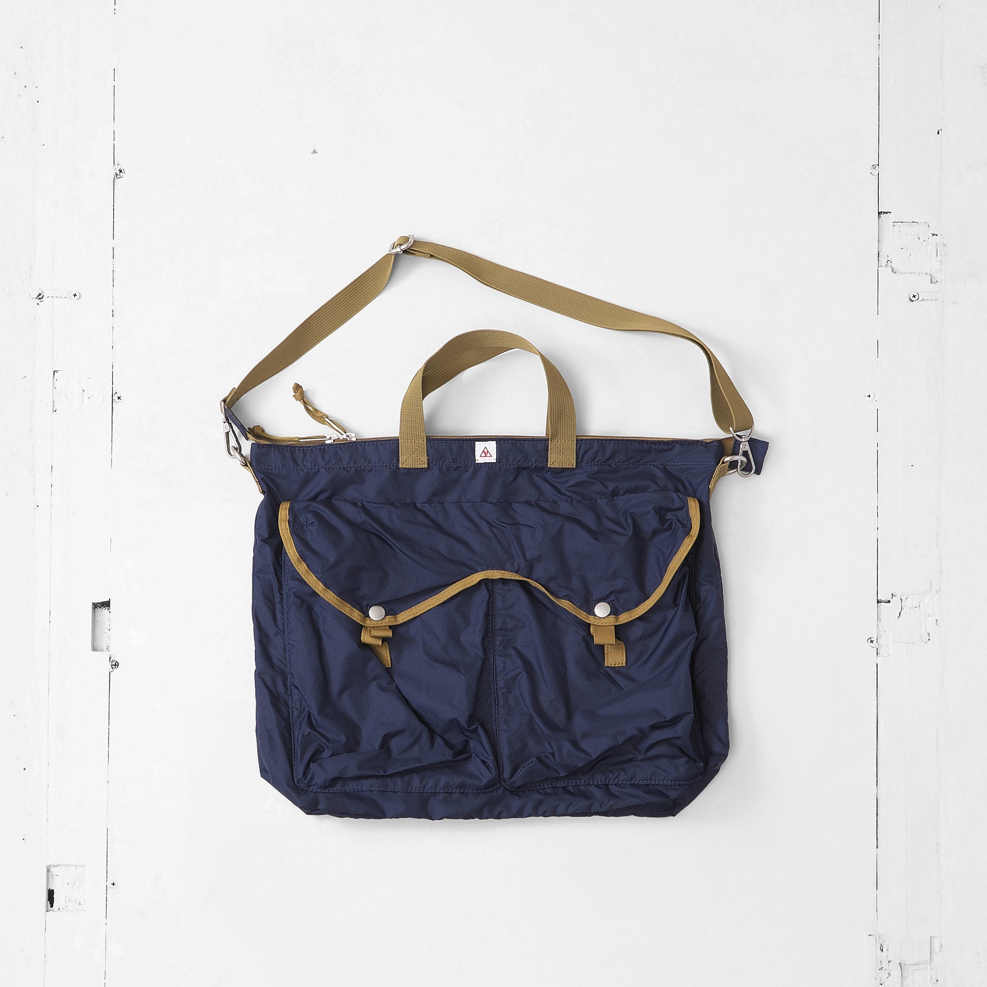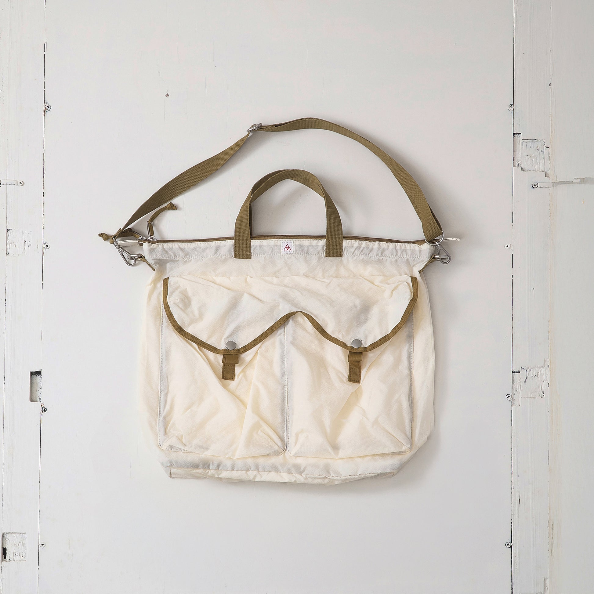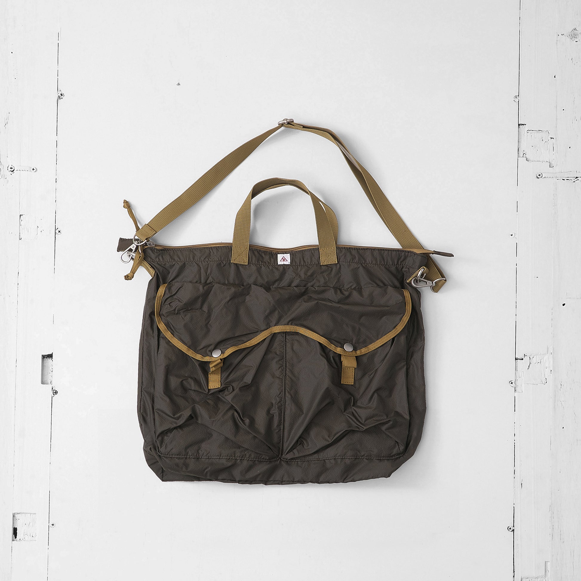軽量ナイロン素材を使用し、ヘルメットバッグをモチーフにデザインしたバッグです。薄手のナイロンを使用することで、荷物を入れても重くなりにくく、日常使いしやすいバランスに仕上げました。バリスティックナイロンのような重さを避け、軽さと扱いやすさを重視しています。サイズは従来のヘルメットバッグより高さを抑え、持ちやすく収まりの良いサイズ感に。外側の大きなポケットがデザインのアクセントとなり、内側にはキーフックと仕切りポケットを備えています。軽さと実用性を両立した、dipらしいアレンジのバッグです。