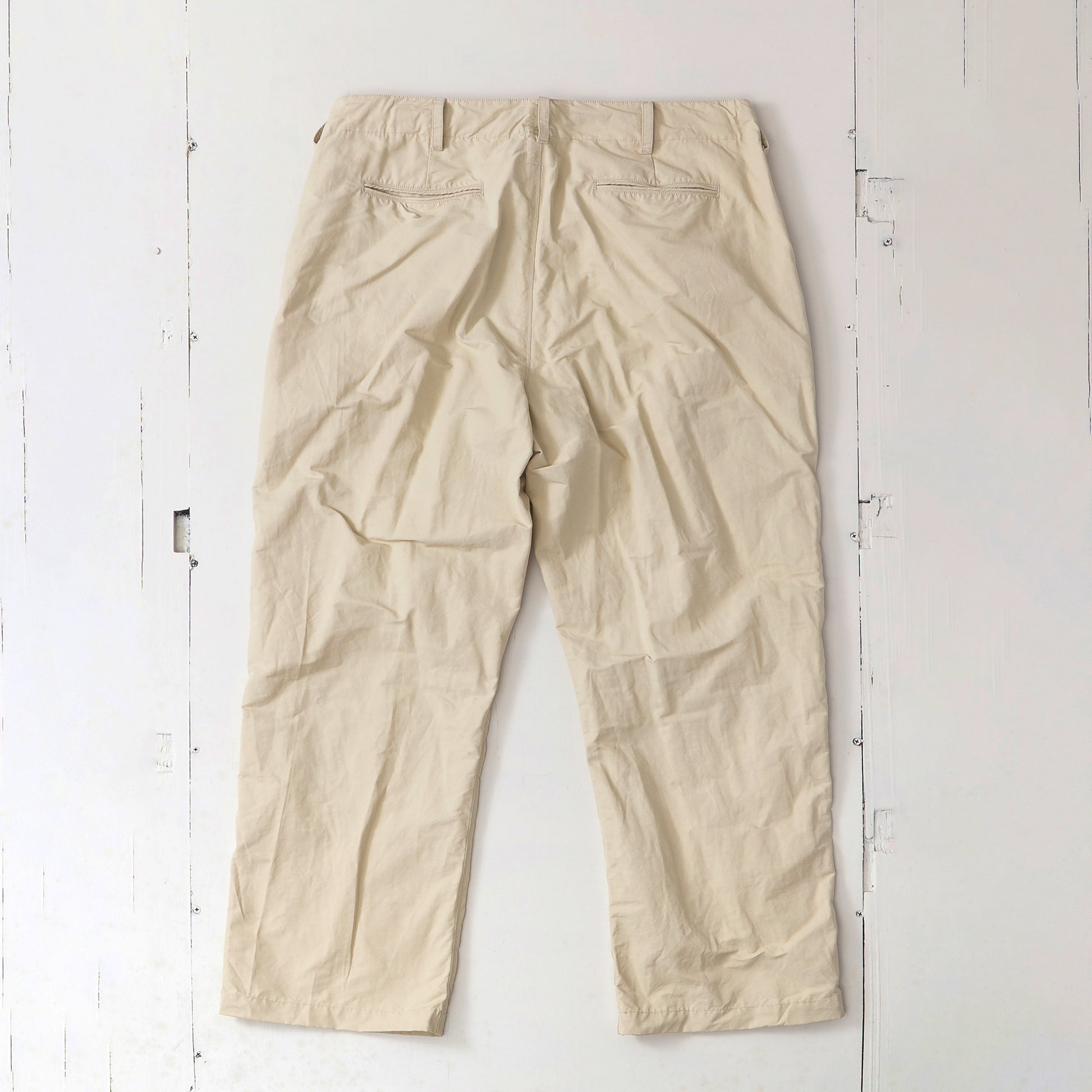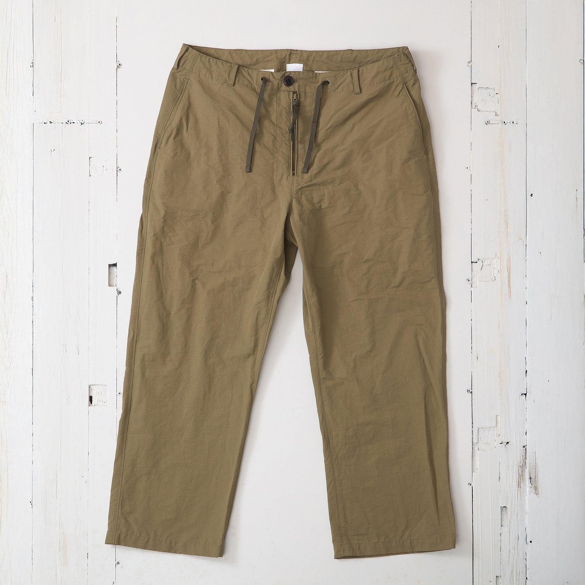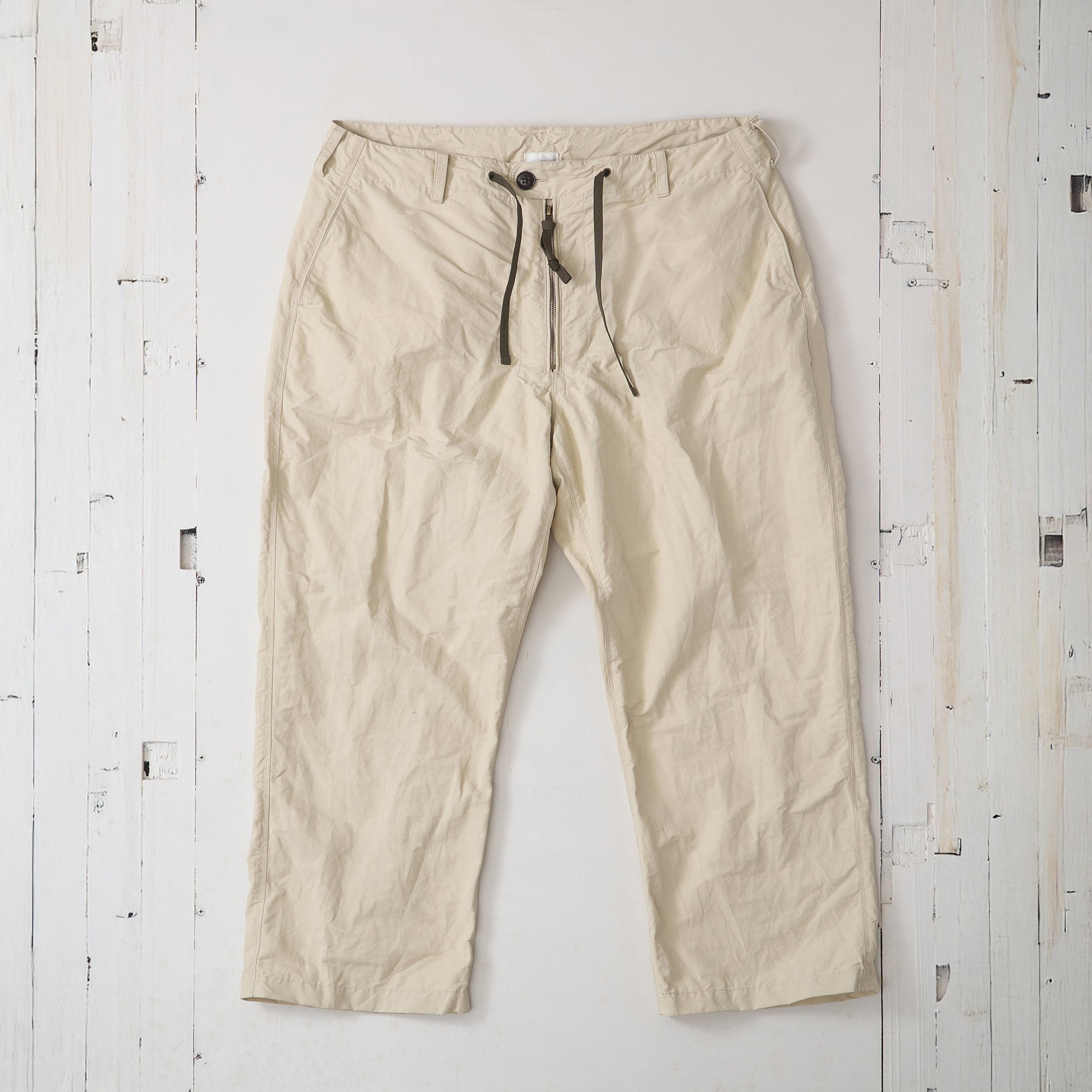 コットンナイロン素材を使用したパンツです。 洗い上がりのシワ感やパッカリング、強度のバランスは、コットン100%とは異なる表情があり、dipとして好んで採用しています。 フロントはムシ見せのジップ仕様。生地を噛まないようタコ糸を入れ、細かなトラブルを防ぐ仕様にしています。 不具合が出やすい箇所については事前に確認を重ね、縫製段階で問題が起きにくいよう配慮しました。 ウエストはストリングスで調整可能。アイテムを選ばず、コーディネートの幅がひろがるアイテムです。