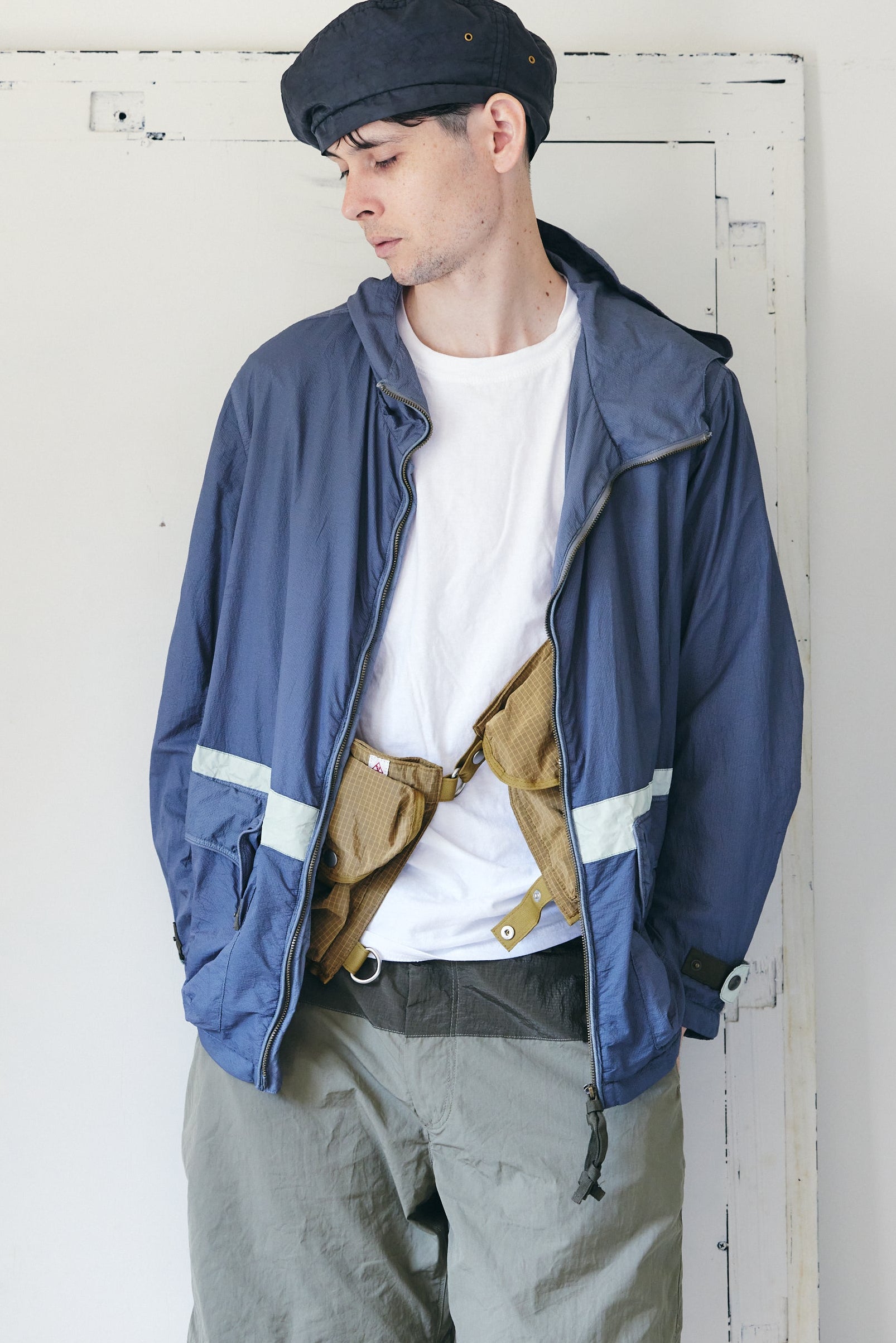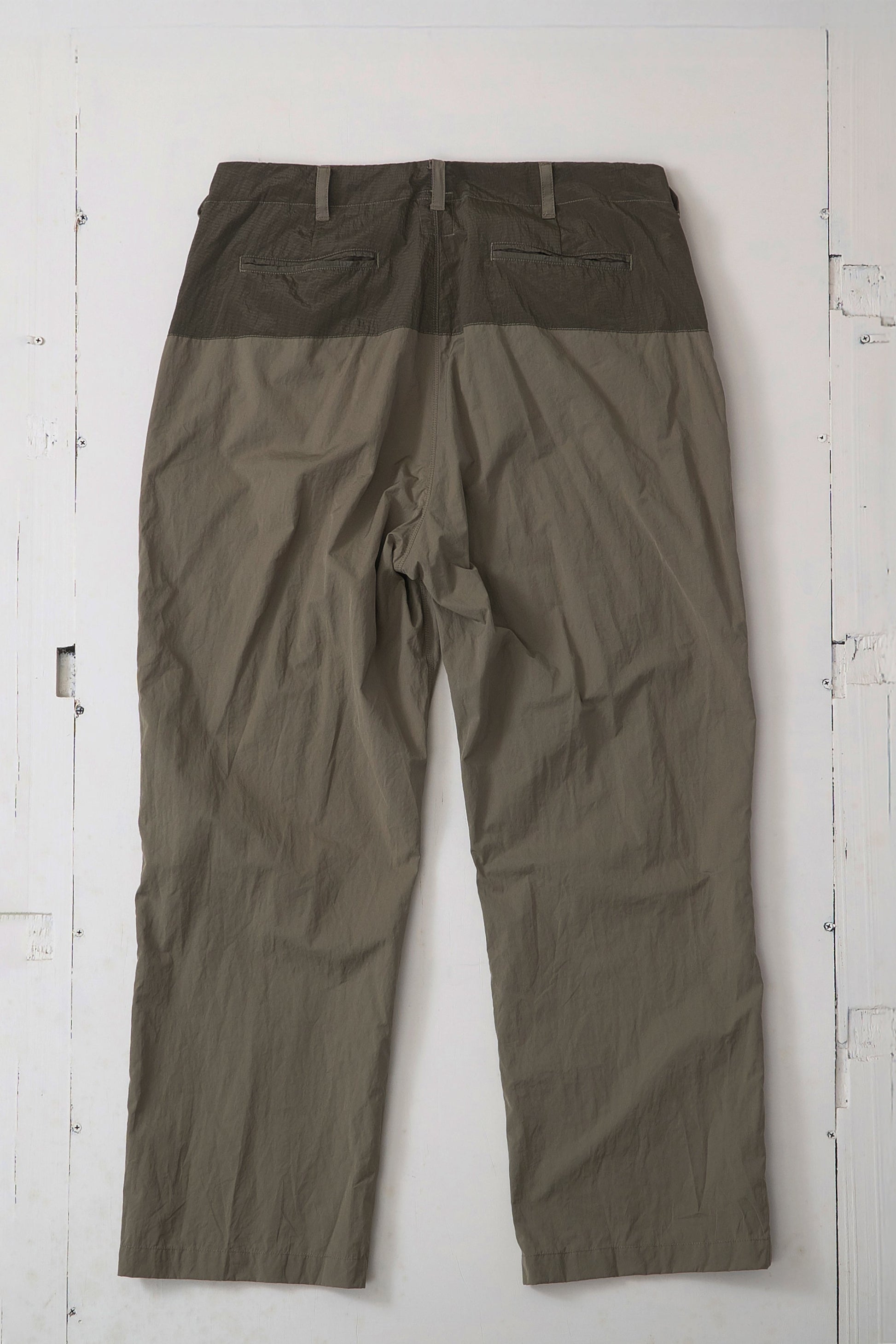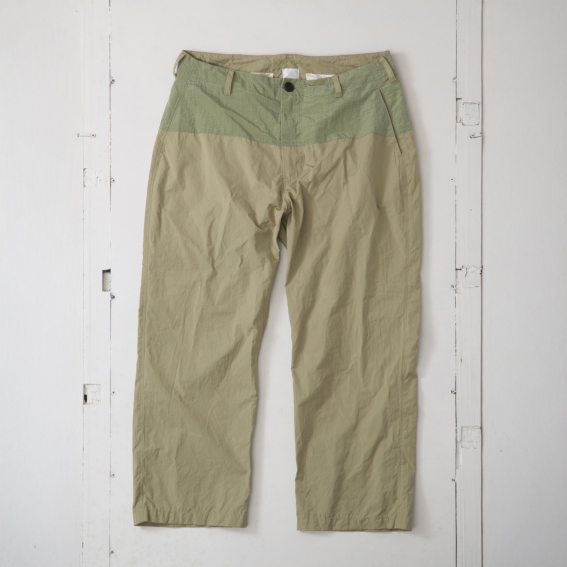 ナイロンコットン素材をベースに、ウエストから上部にナイロンパッチを配したパンツです。春夏はどうしてもレイヤードが減り、スタイルがシンプルになりがち。そこであえて異素材を組み合わせ、カラーコンビで表情を加えました。Tシャツとパンツだけのスタイルでも、さりげなく個性を主張できる一本です。