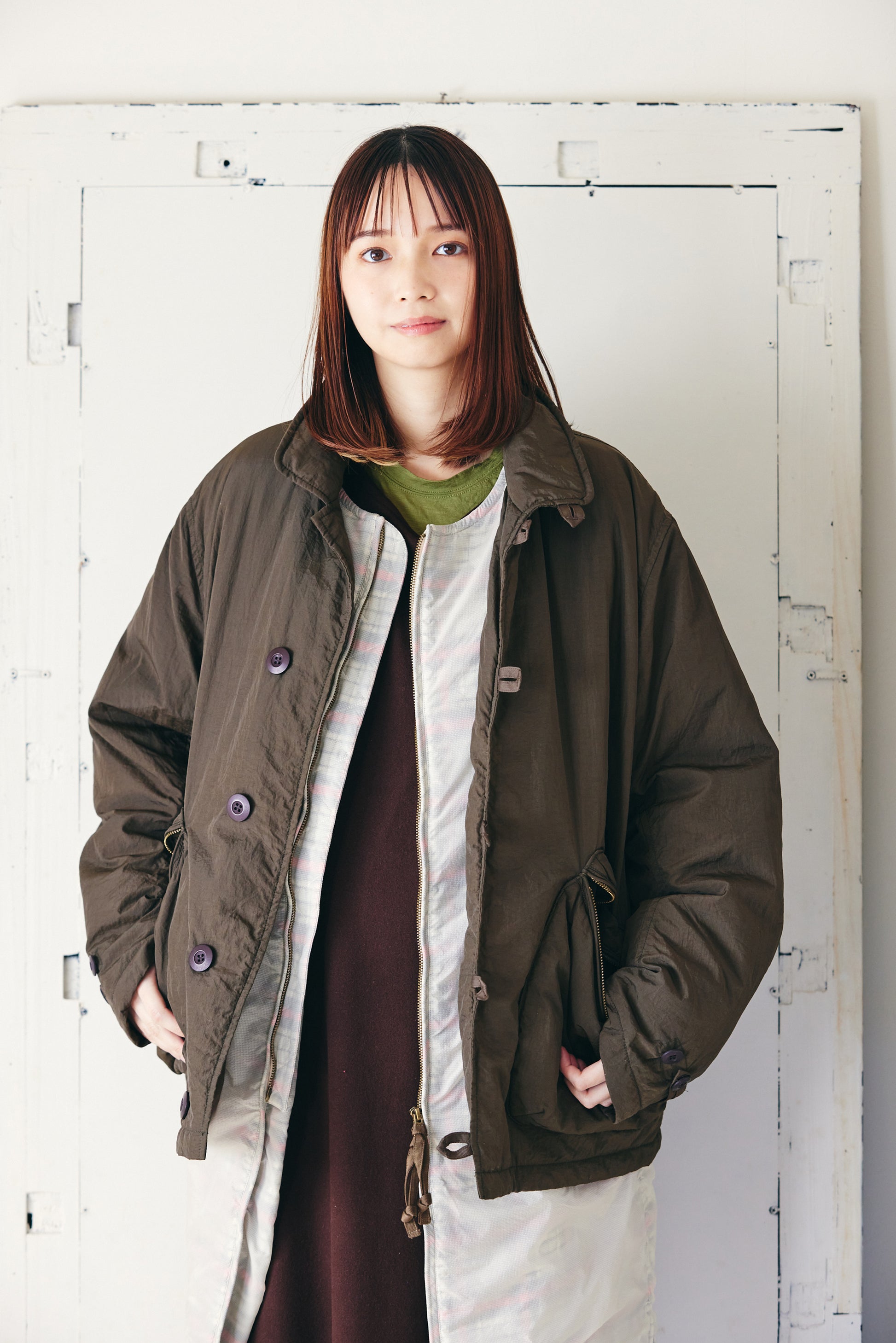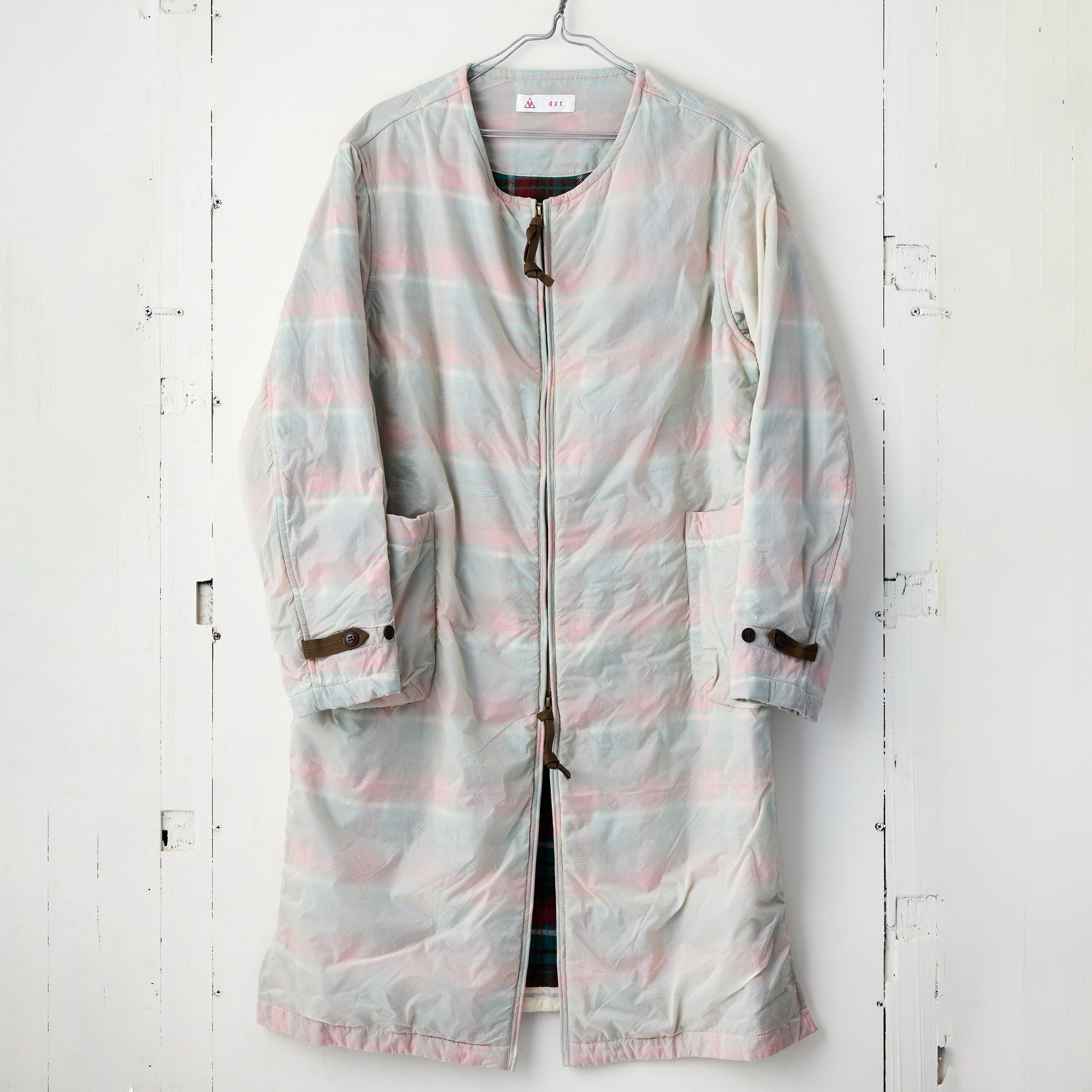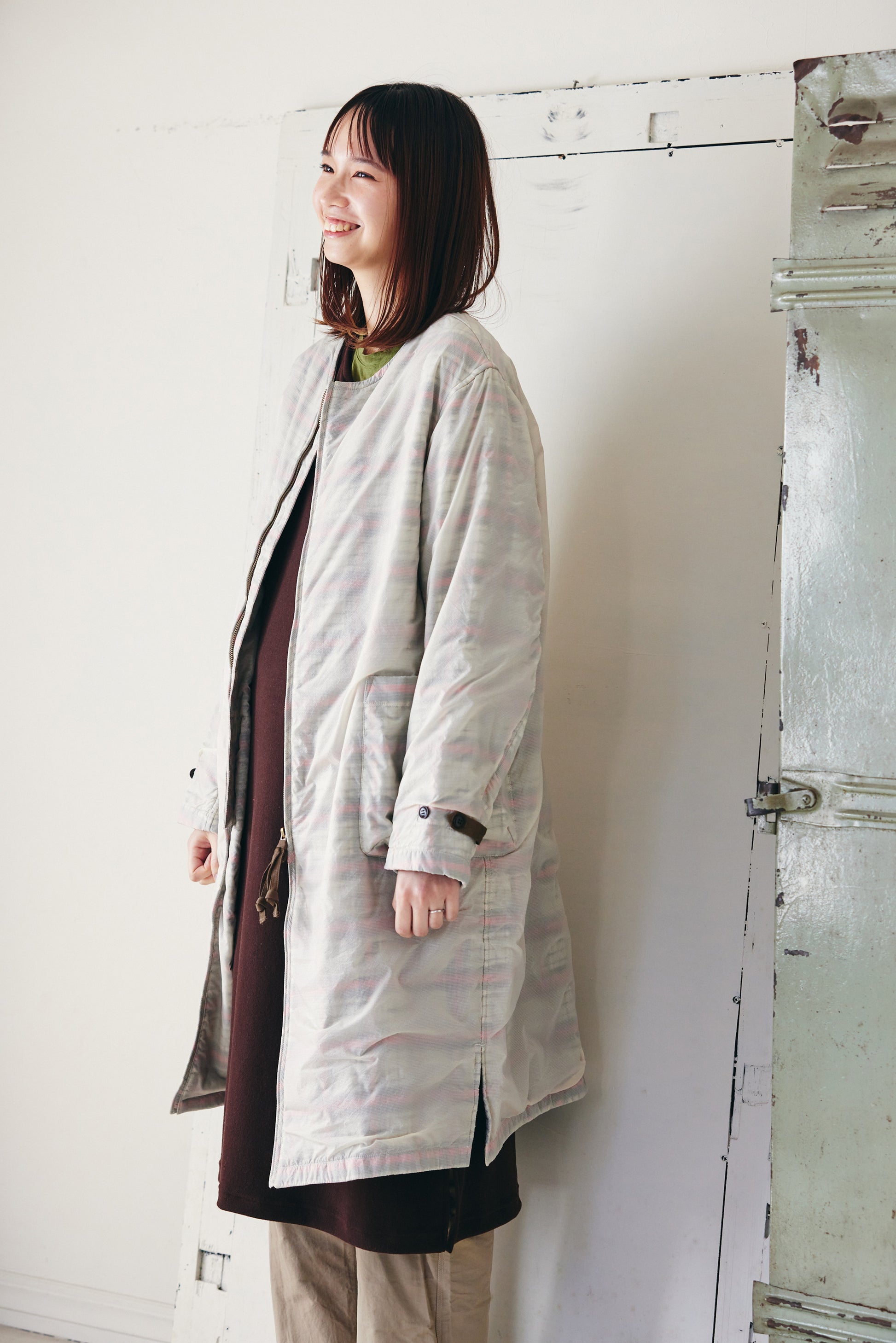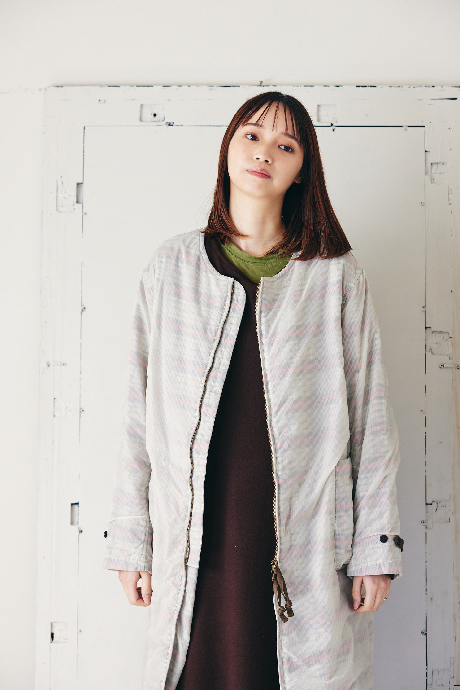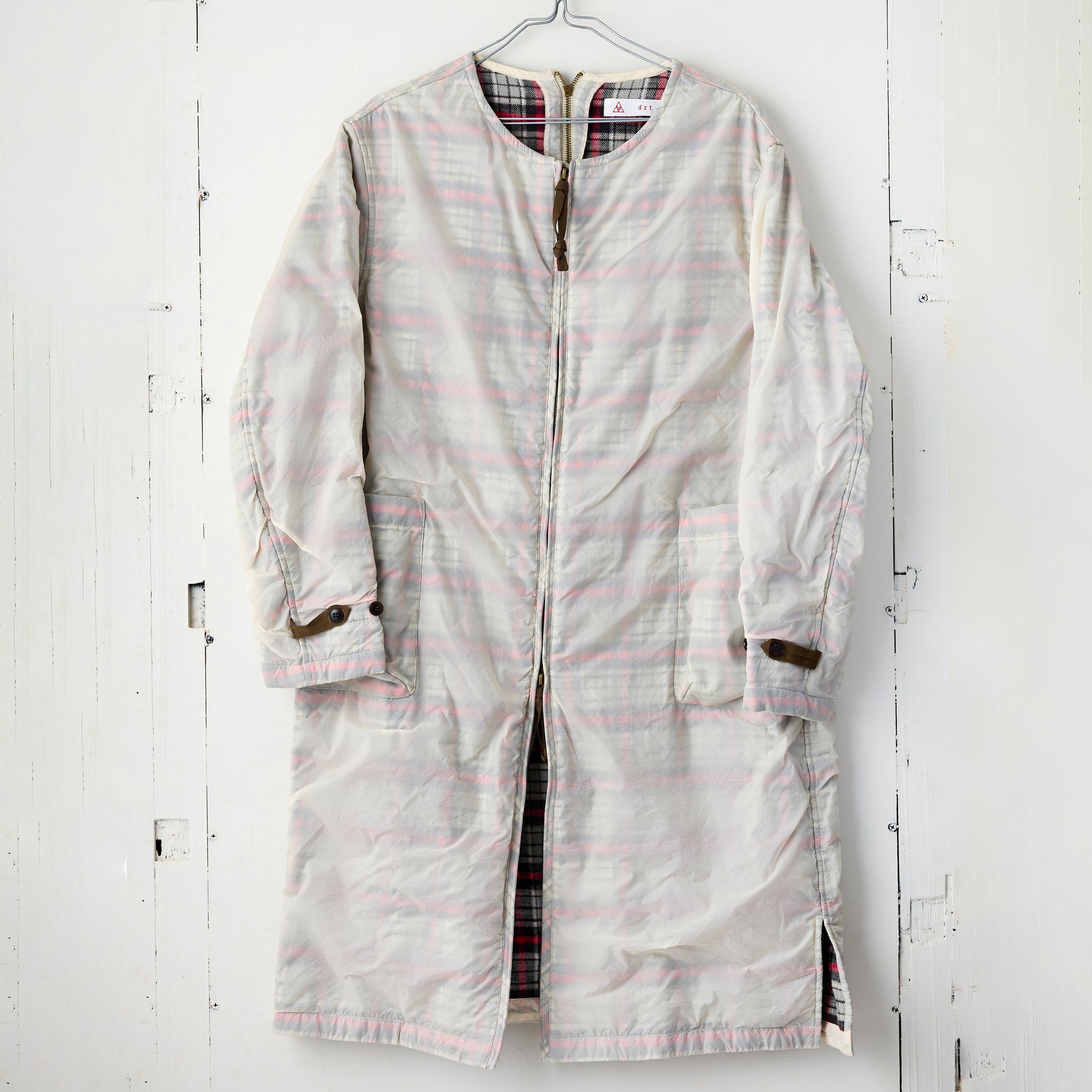 チェック素材の上に薄いのナイロン素材を重ねて、柄が透けて新鮮な見え方になる様にデザインをしたアウターです。 手の届くチェック素材を使用しているので、保温力もあります。