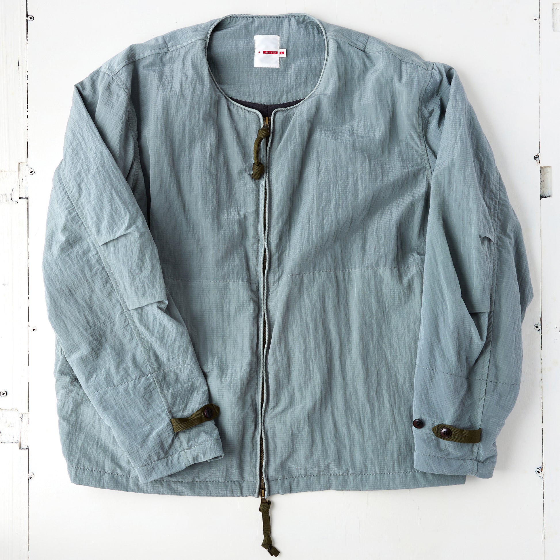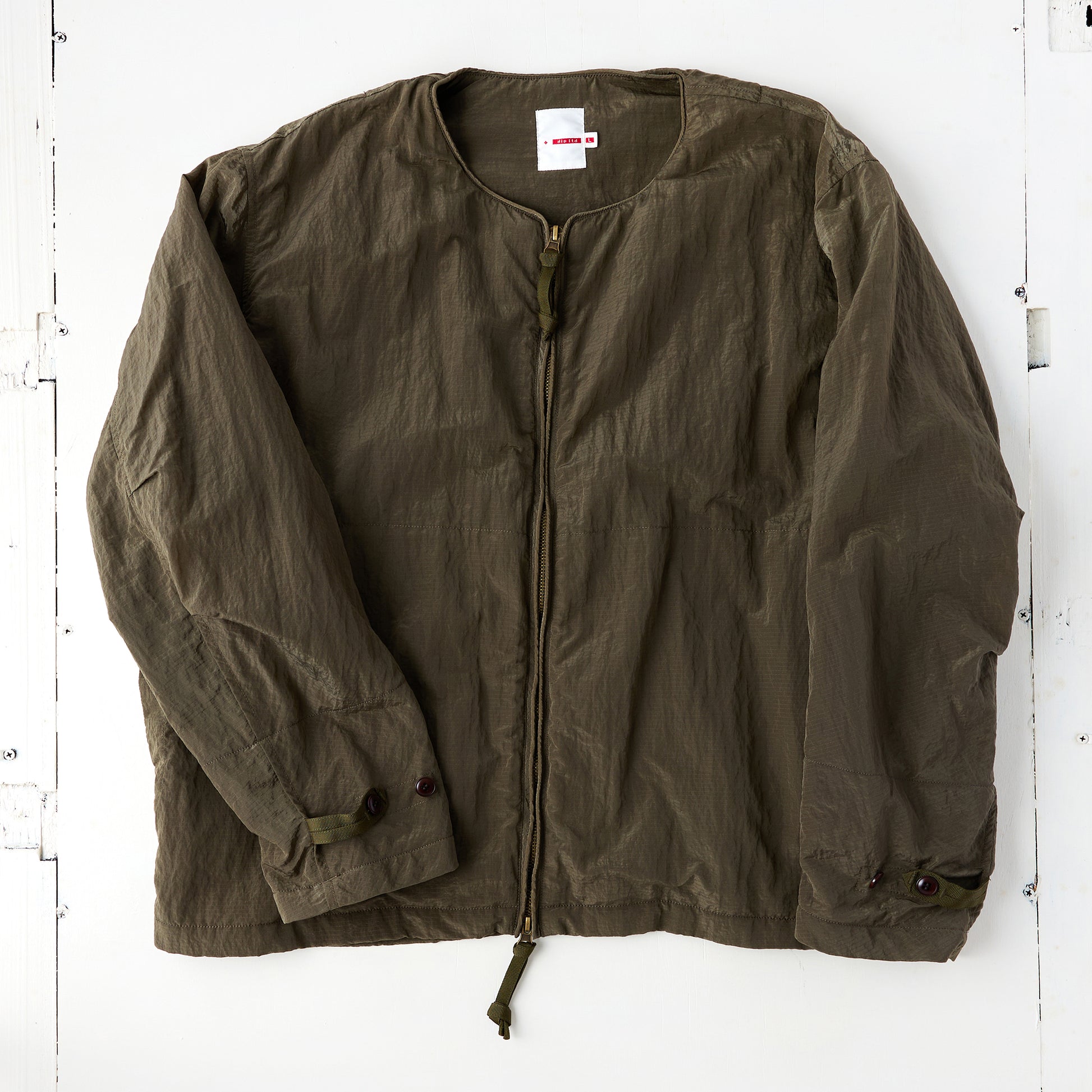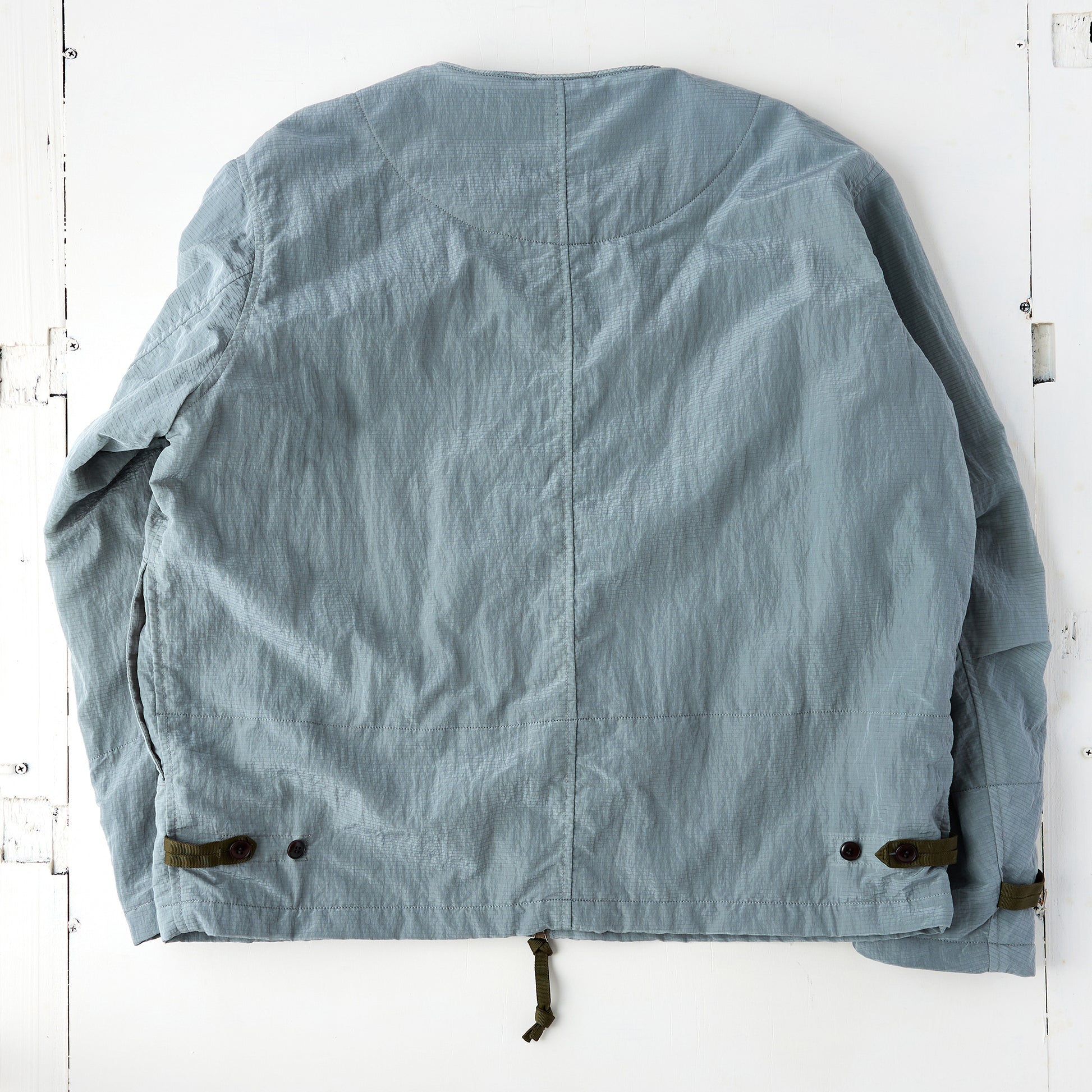 ナイロン素材を使用したノーカラージャケットです。 裏地にフリー素材を使用しました。 アーミーのモチーフをなくしてシンプルに仕上げているので、アウターはもちろんインナーとしてもコーディネートしやすいアイテムです。 冬はインナーとしてコーデイネートするとダークな色になりがちなので、明るめのサックスも入れました。