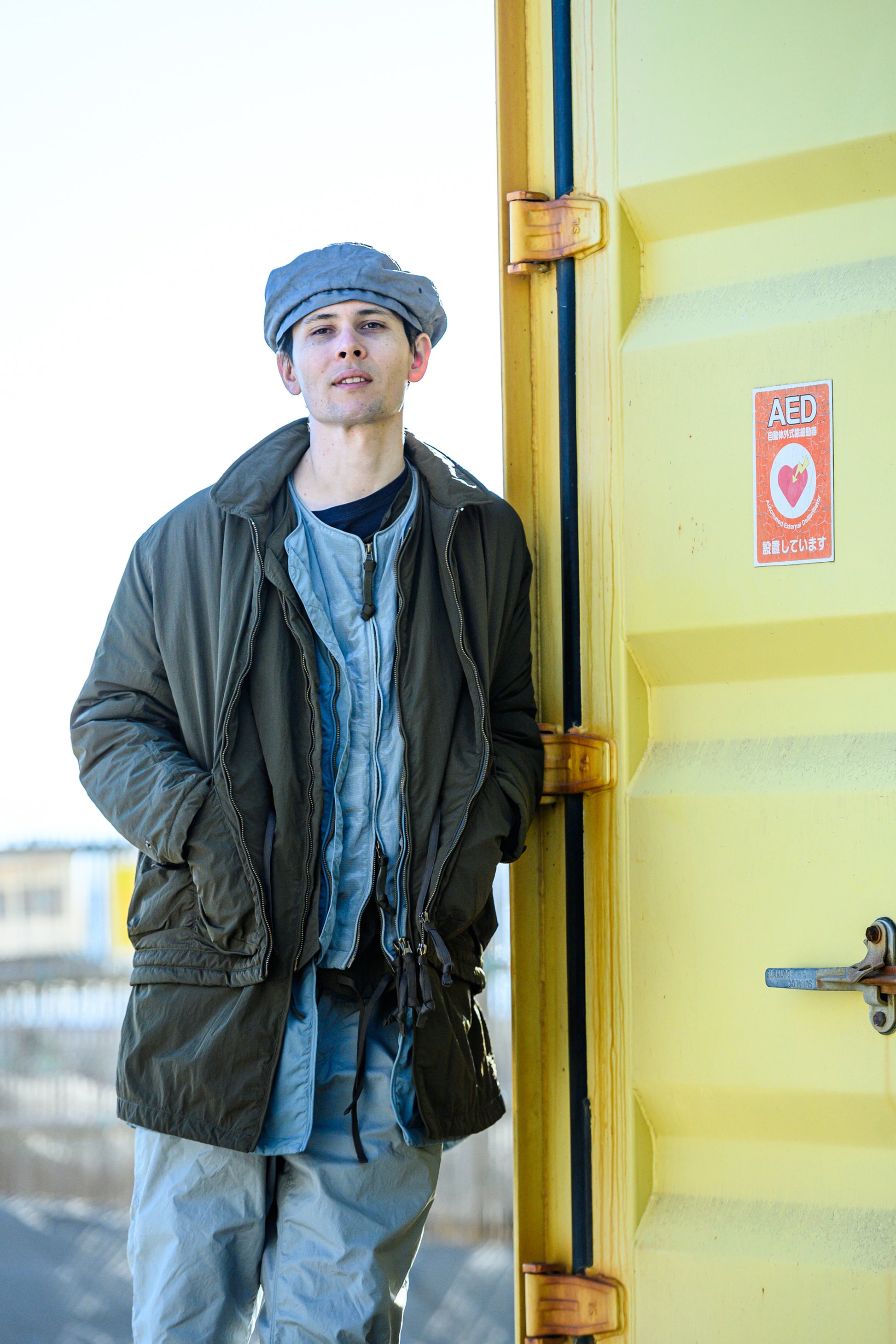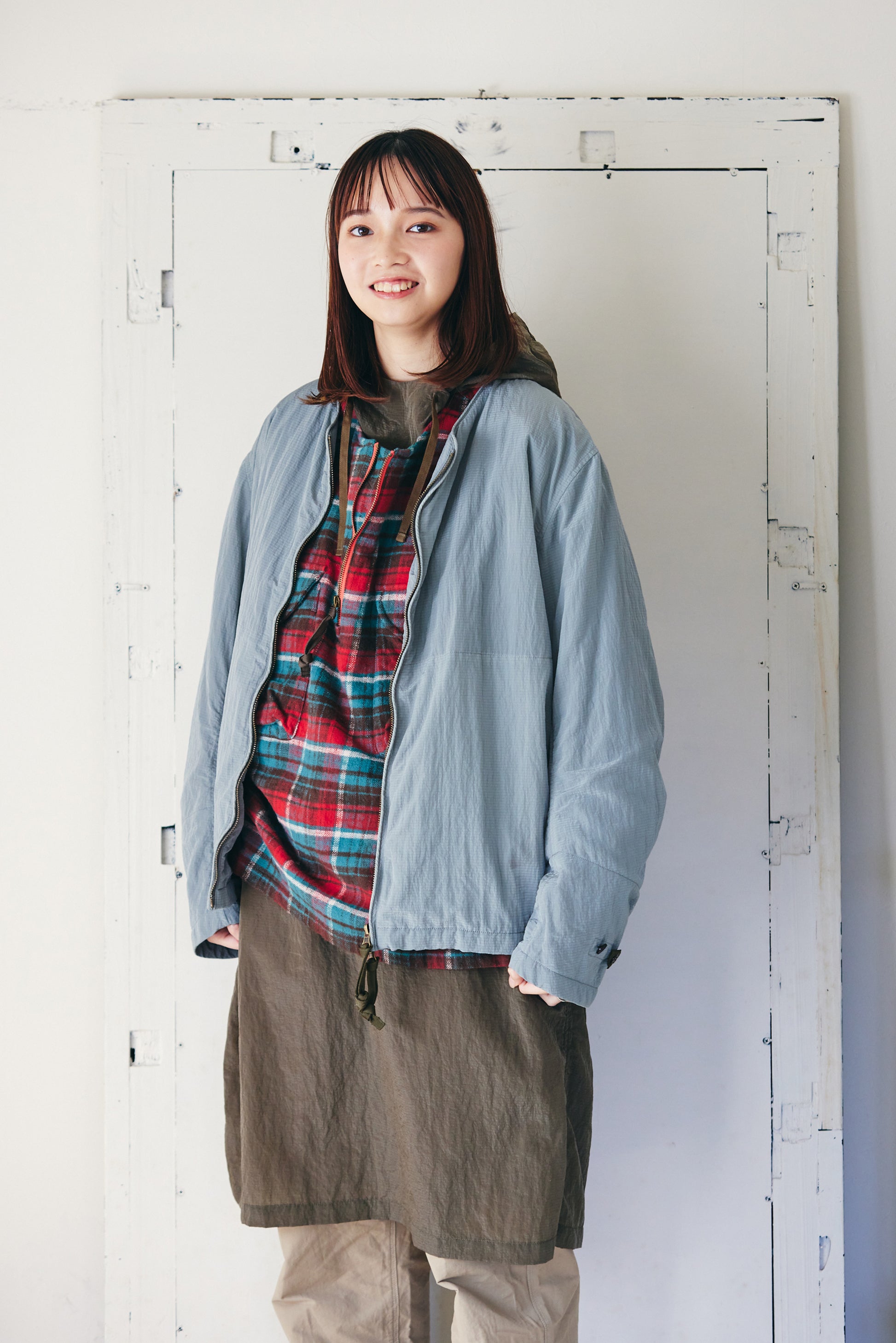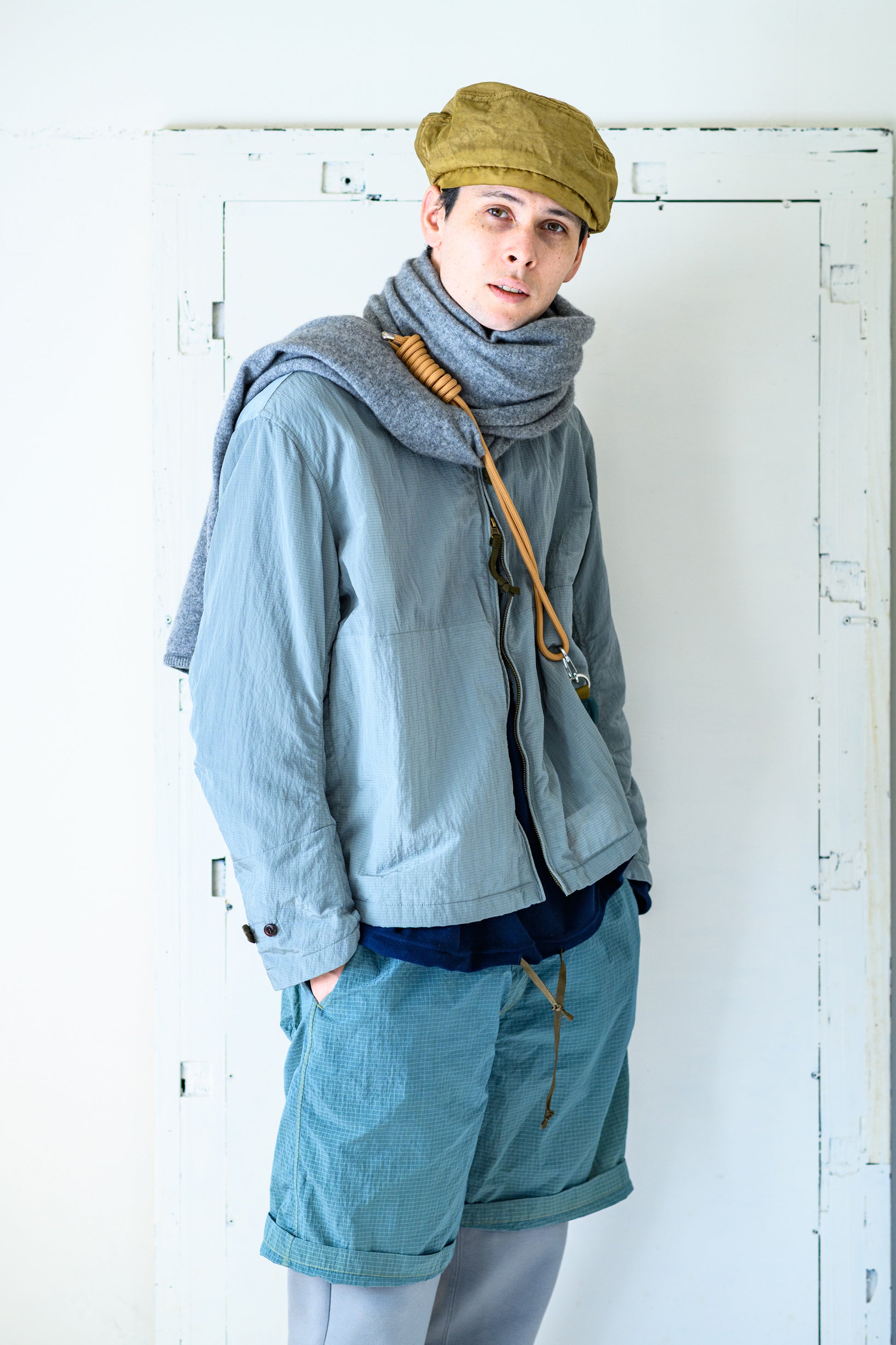ナイロン素材を使用したノーカラージャケットです。 裏地にフリー素材を使用しました。 アーミーのモチーフをなくしてシンプルに仕上げているので、アウターはもちろんインナーとしてもコーディネートしやすいアイテムです。 冬はインナーとしてコーデイネートするとダークな色になりがちなので、明るめのサックスも入れました。