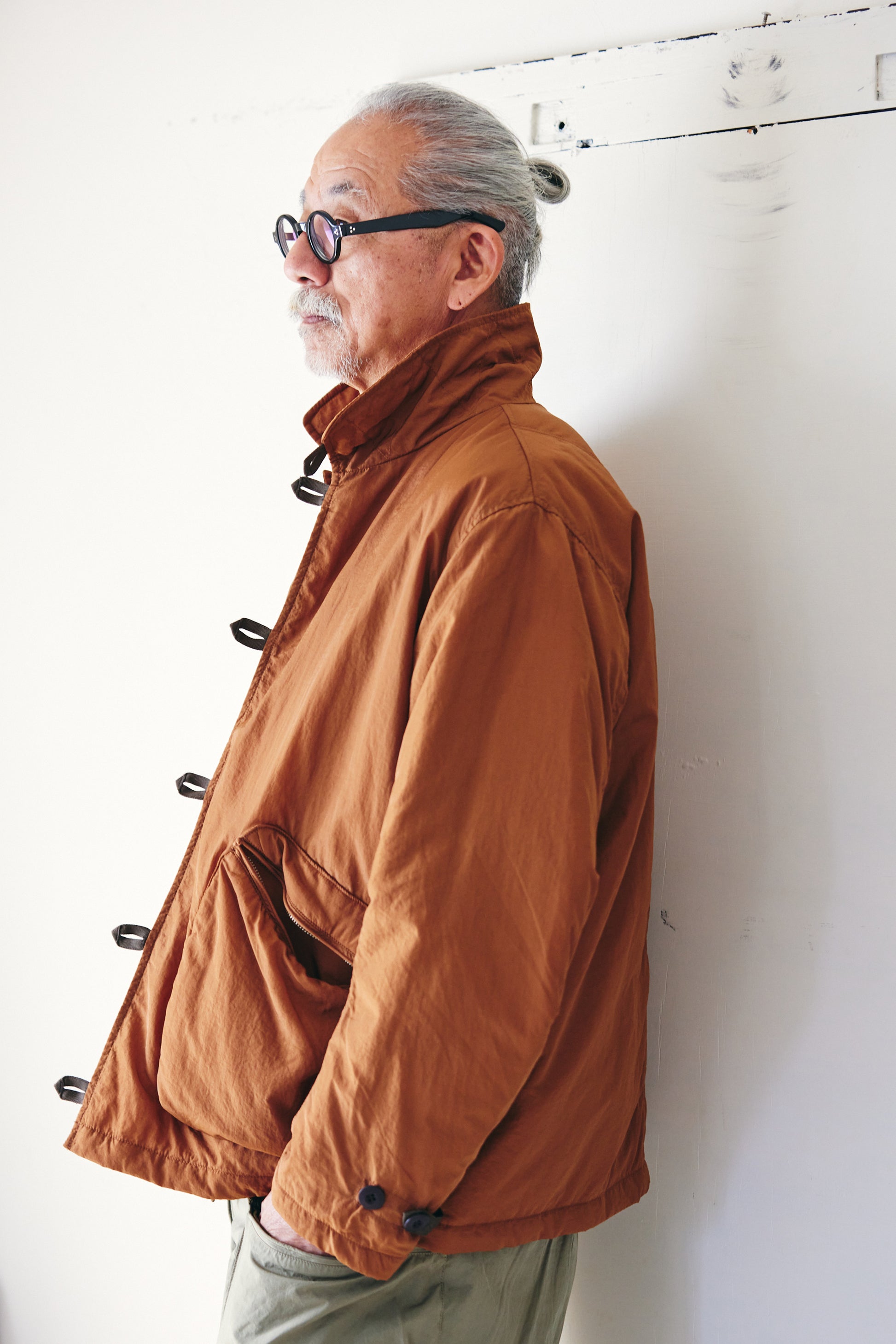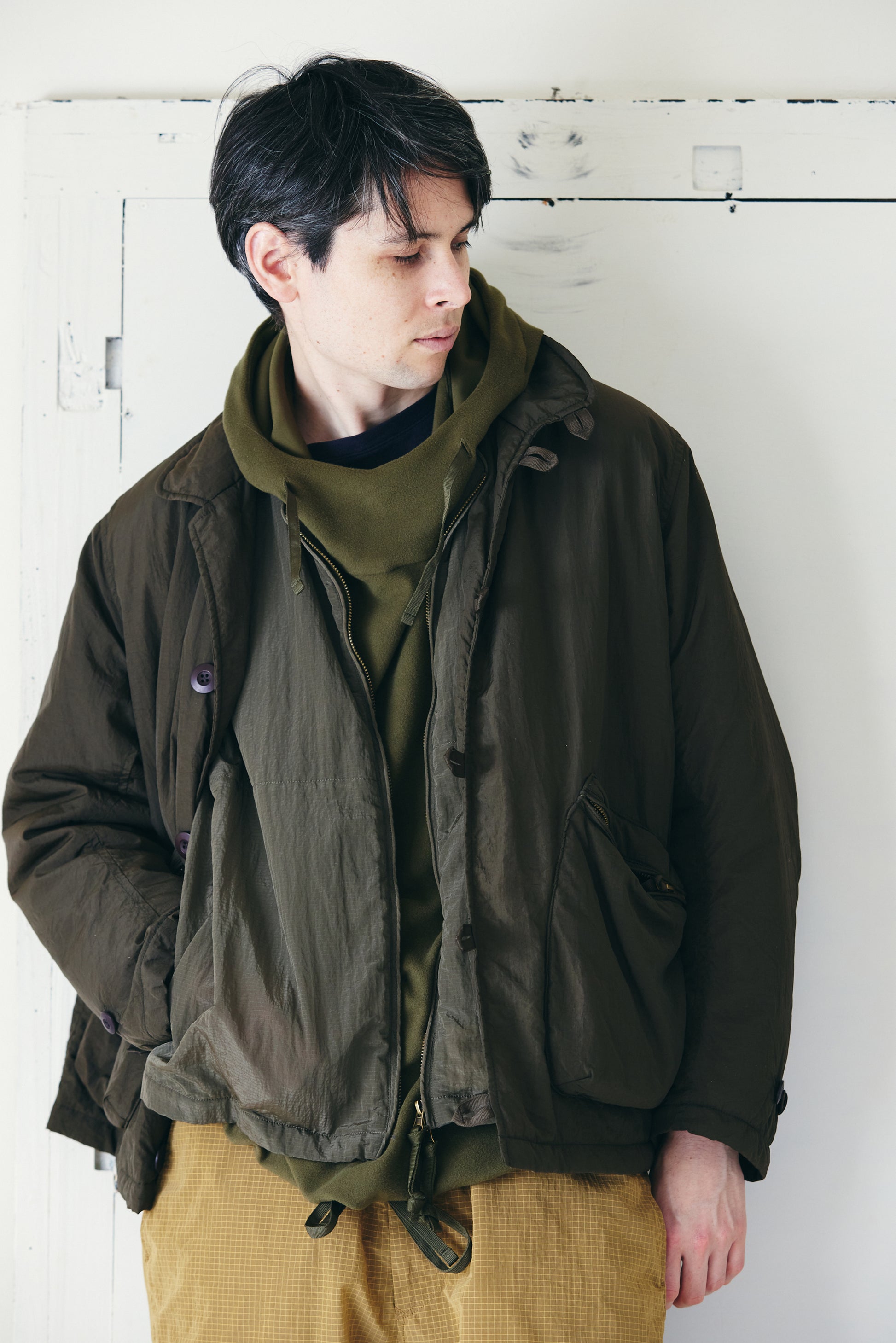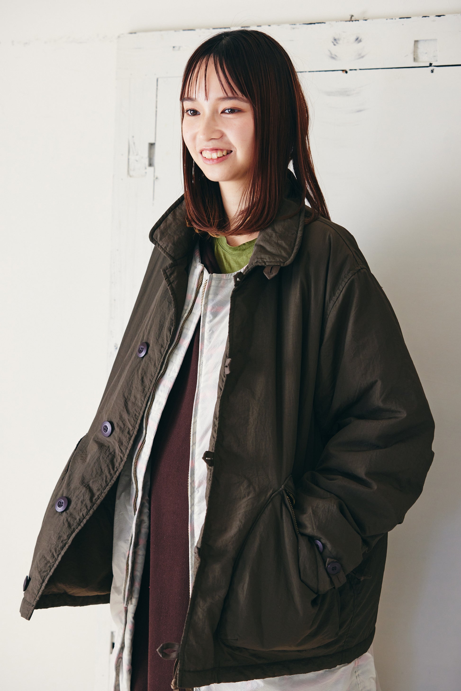 ナイロン素材を使用した中綿入りアウターです。通常ボタンのフロントループはコットンの紐を使いますが、あえてポリテープを使用し、ポイントになる様にデザインをしました。ポケットはフラットな見え方にならない様に、ダーツを入れて立体感を出しています。中綿はあまり厚くならない様に60gのシンサレートを使用しています。もたつきが少なく、重ね着がしやすい程よい厚さです。もちろん保温力も◎