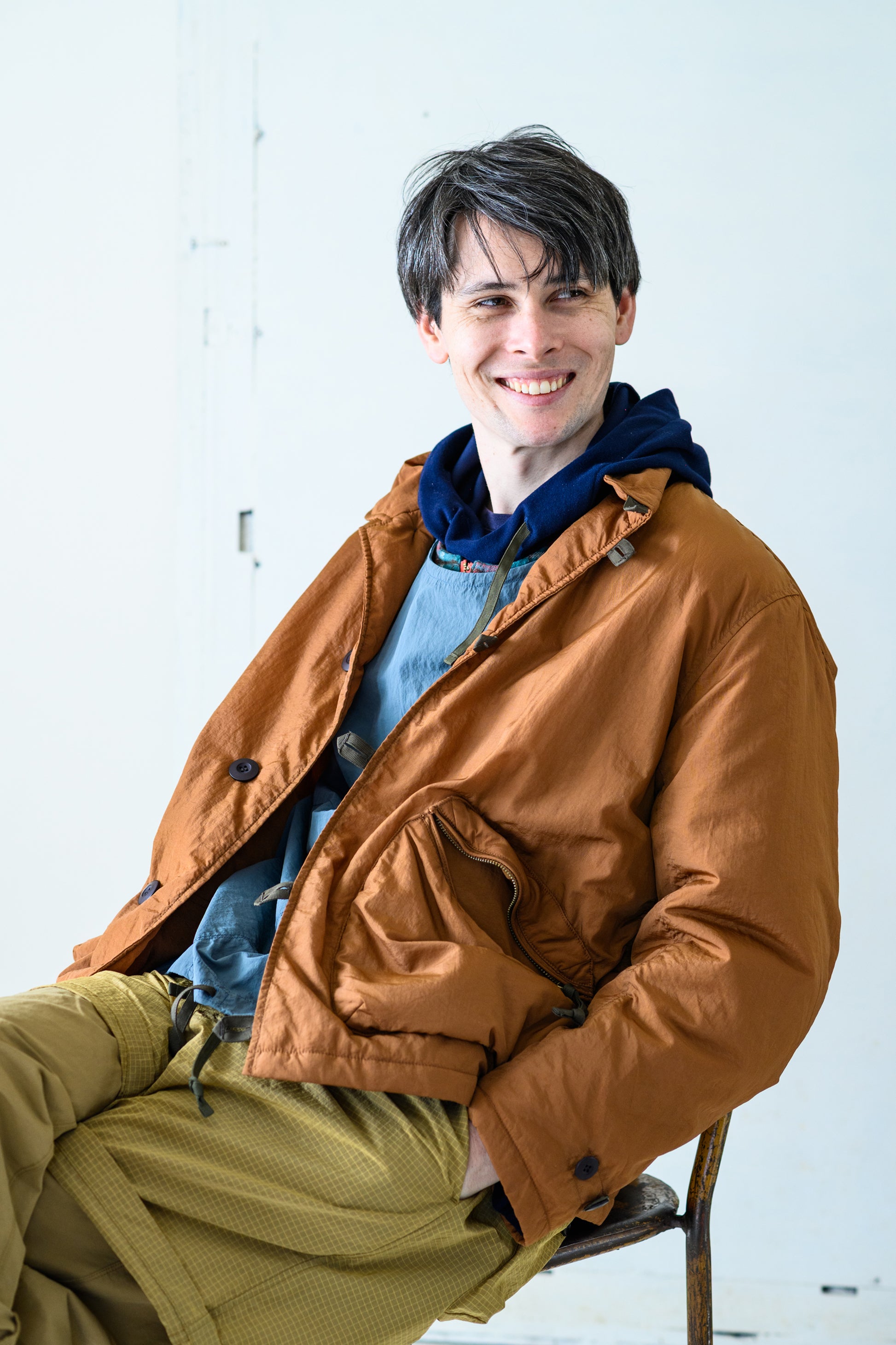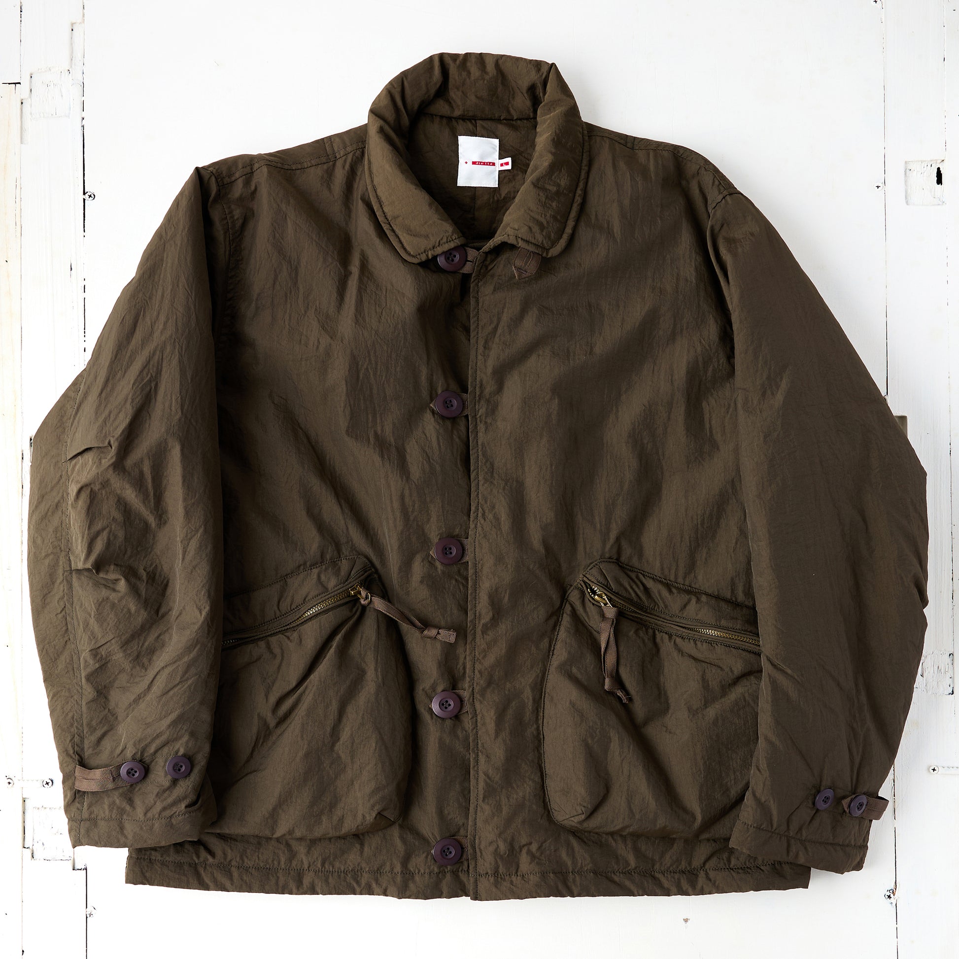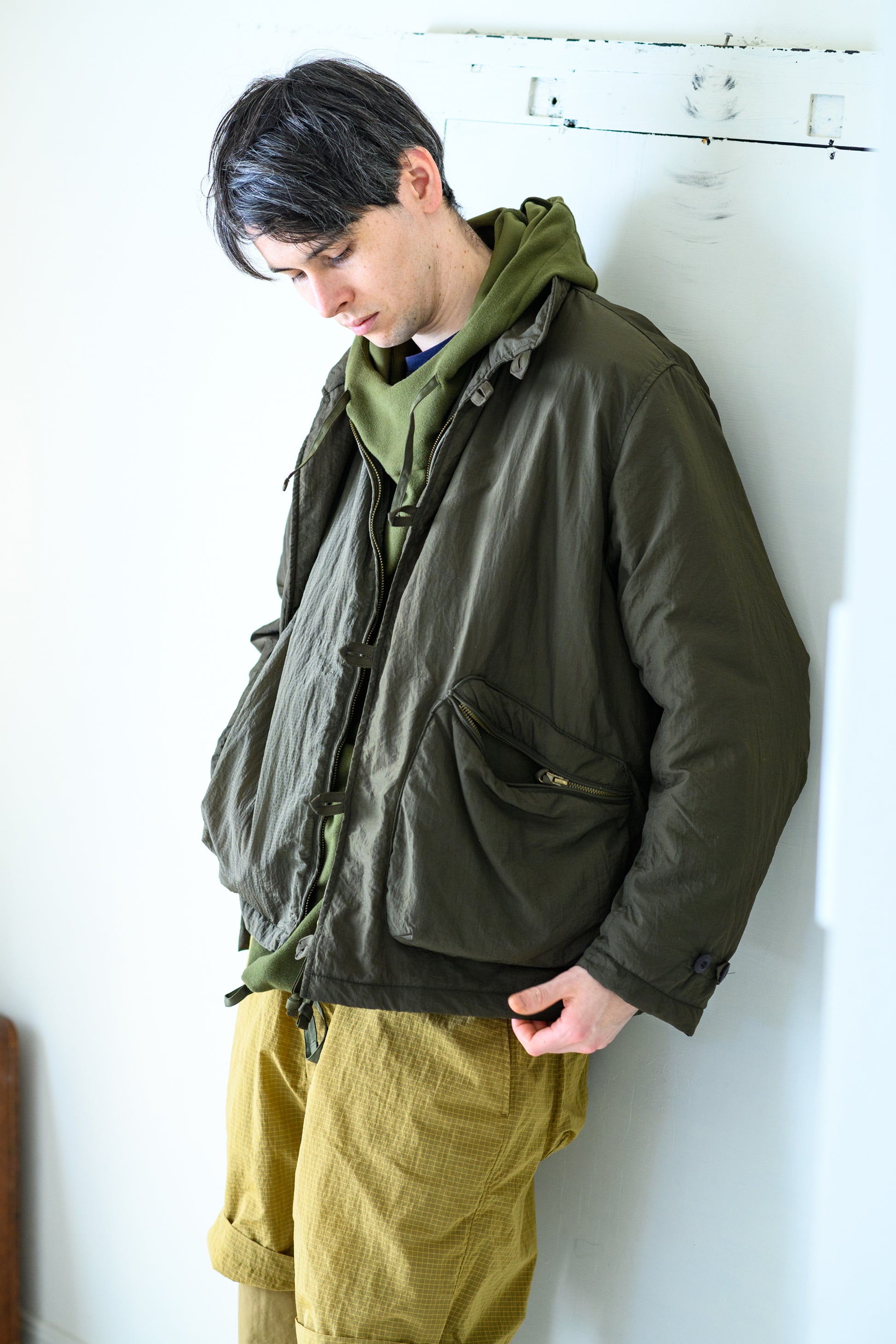 ナイロン素材を使用した中綿入りアウターです。通常ボタンのフロントループはコットンの紐を使いますが、あえてポリテープを使用し、ポイントになる様にデザインをしました。ポケットはフラットな見え方にならない様に、ダーツを入れて立体感を出しています。中綿はあまり厚くならない様に60gのシンサレートを使用しています。もたつきが少なく、重ね着がしやすい程よい厚さです。もちろん保温力も◎