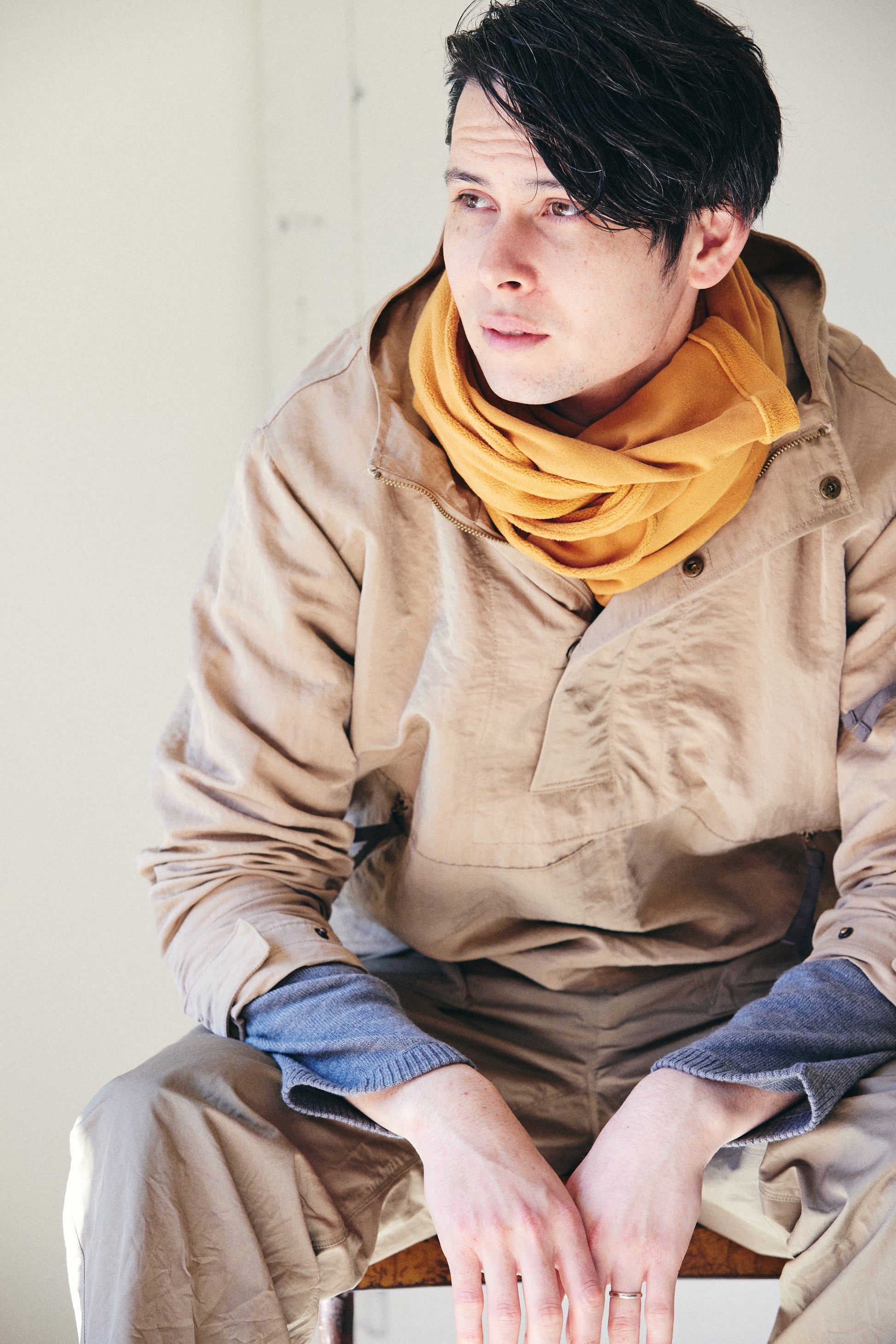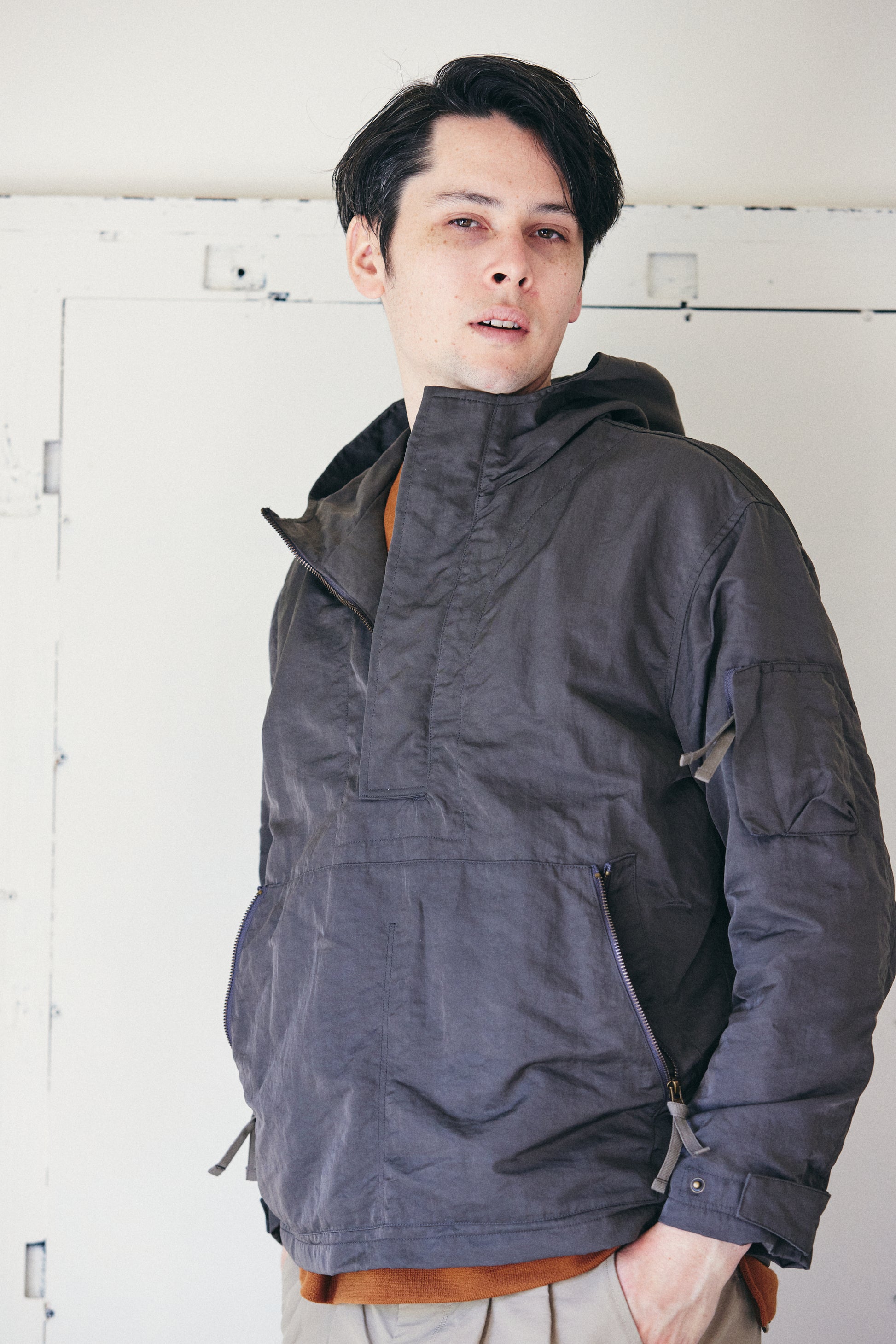 ナイロンは本来フラットな素材ですが、異なる番手糸の組み合わせと生地加工を施すことで、奥行きのある凹凸と独特のシワ感を生み出した、ヘビーウエイトのナイロンツイルを使用したアノラックです。 ここまでの存在感を持つナイロン素材は珍しく、しっかりとした重量感がありながらも柔らかい質感です。内側にはポリエステルメッシュ素材を配し、着用時の快適さにも配慮しました。いつものコーディネートに新鮮な表情を加えてくれる一着です。