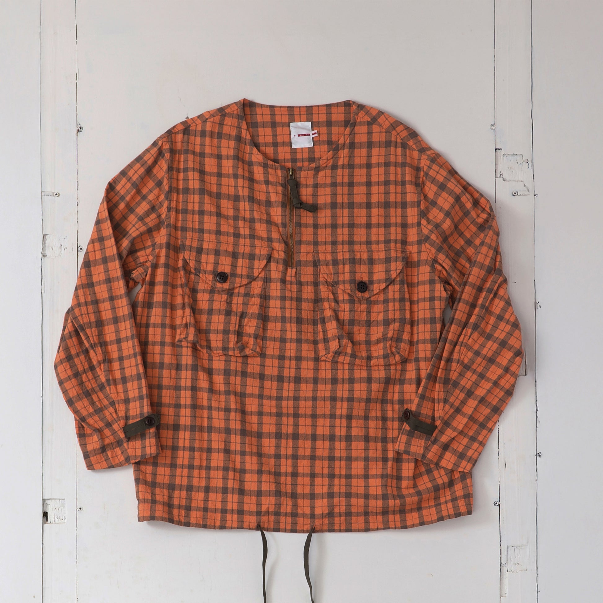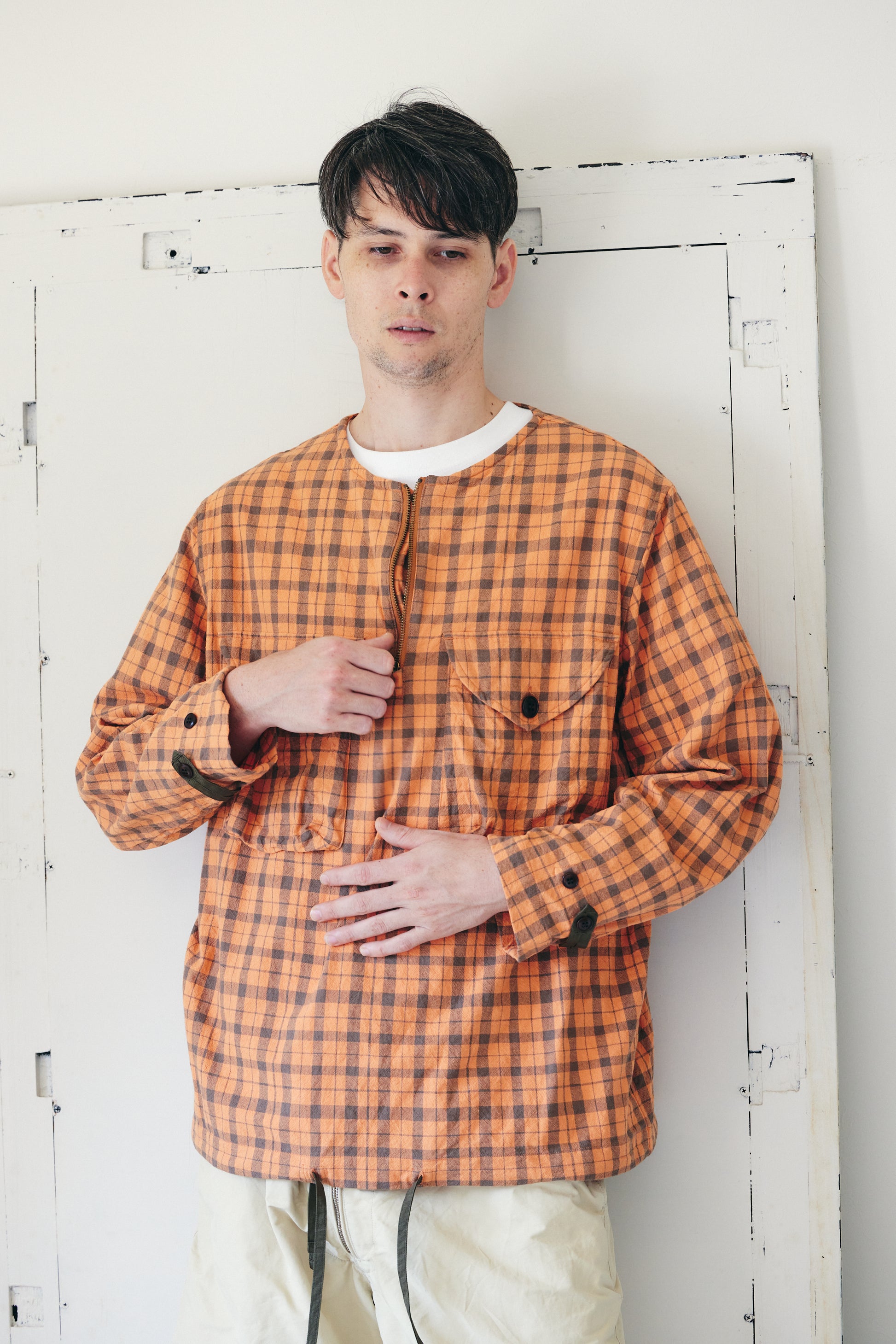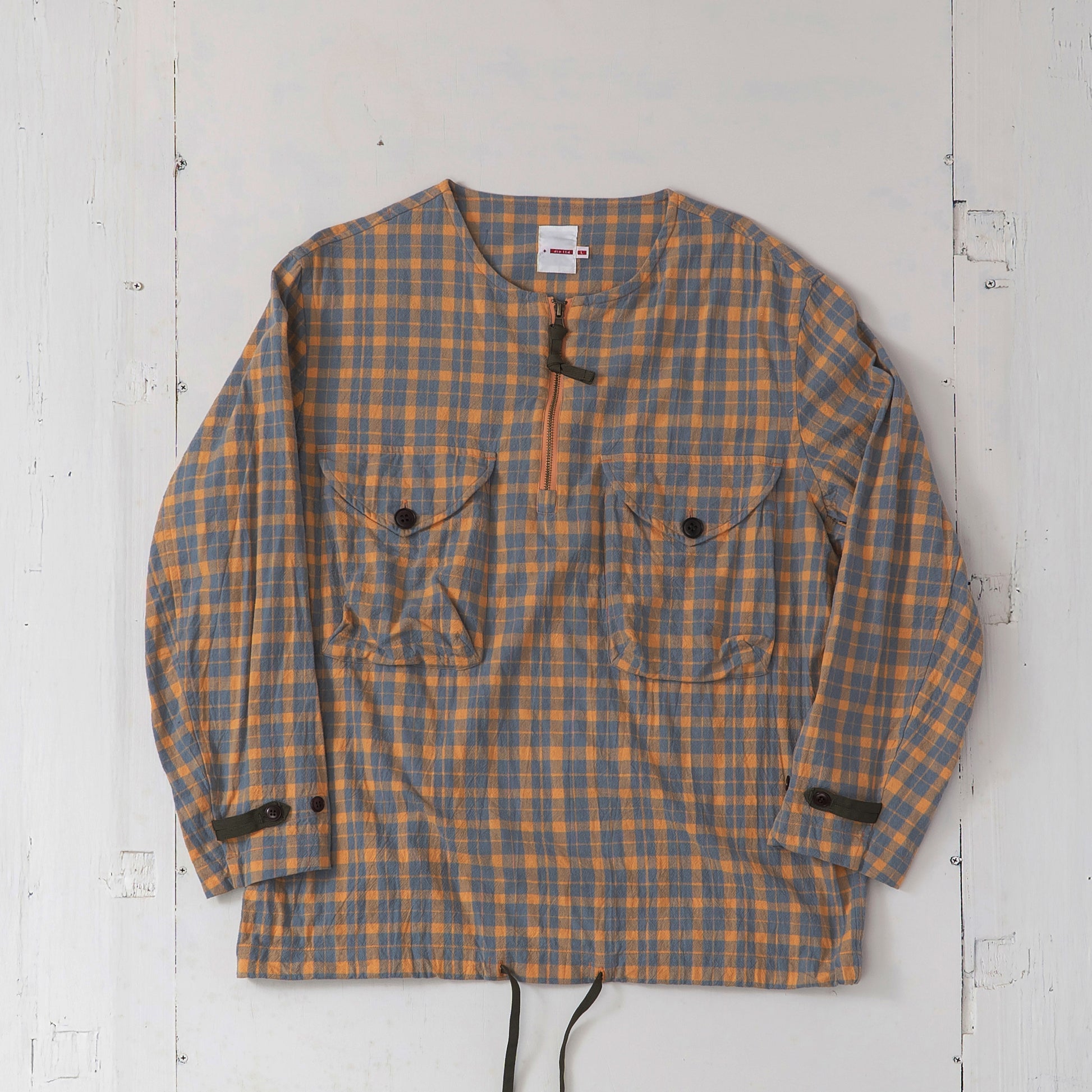 チェック柄のシャツ生地を使用した、プルオーバー仕様の一着です。チェストポケットにはシャツの要素を残しつつ、フロントにはジップを配し、デザインのアクセントにしました。シャツでありながら、アウター感覚でもコーディネートできるバランスに仕上げています。一枚での着用はもちろん、レイヤード時のインナーとしても使いやすいデザインです。裾にはポリテープのストリングスを配し、シルエット調整によってスタイリングの幅が広がります。