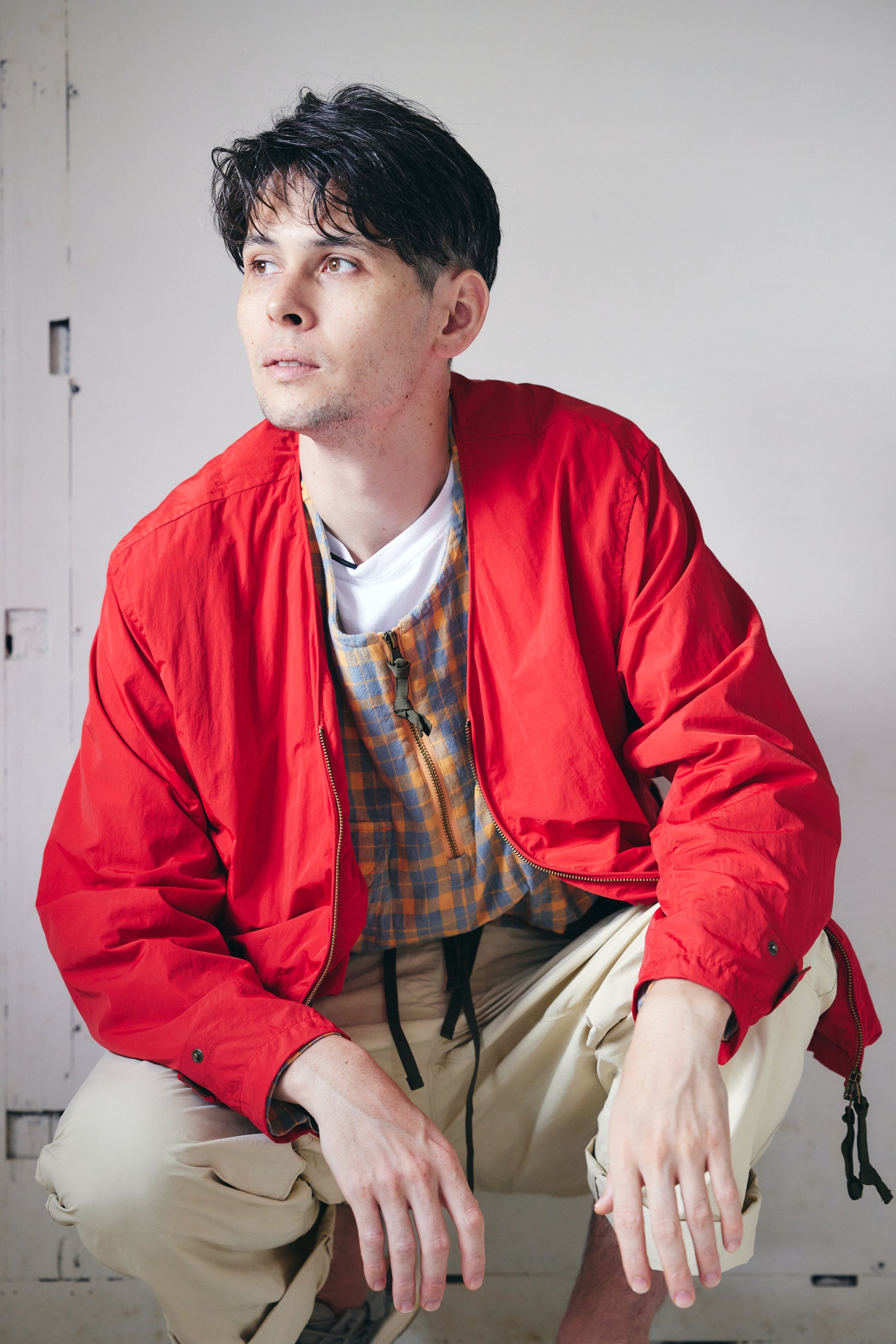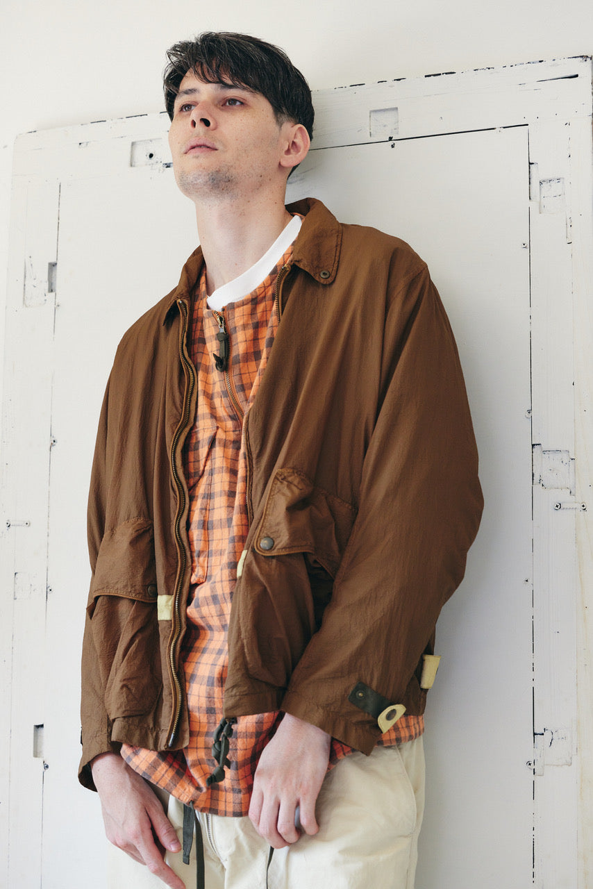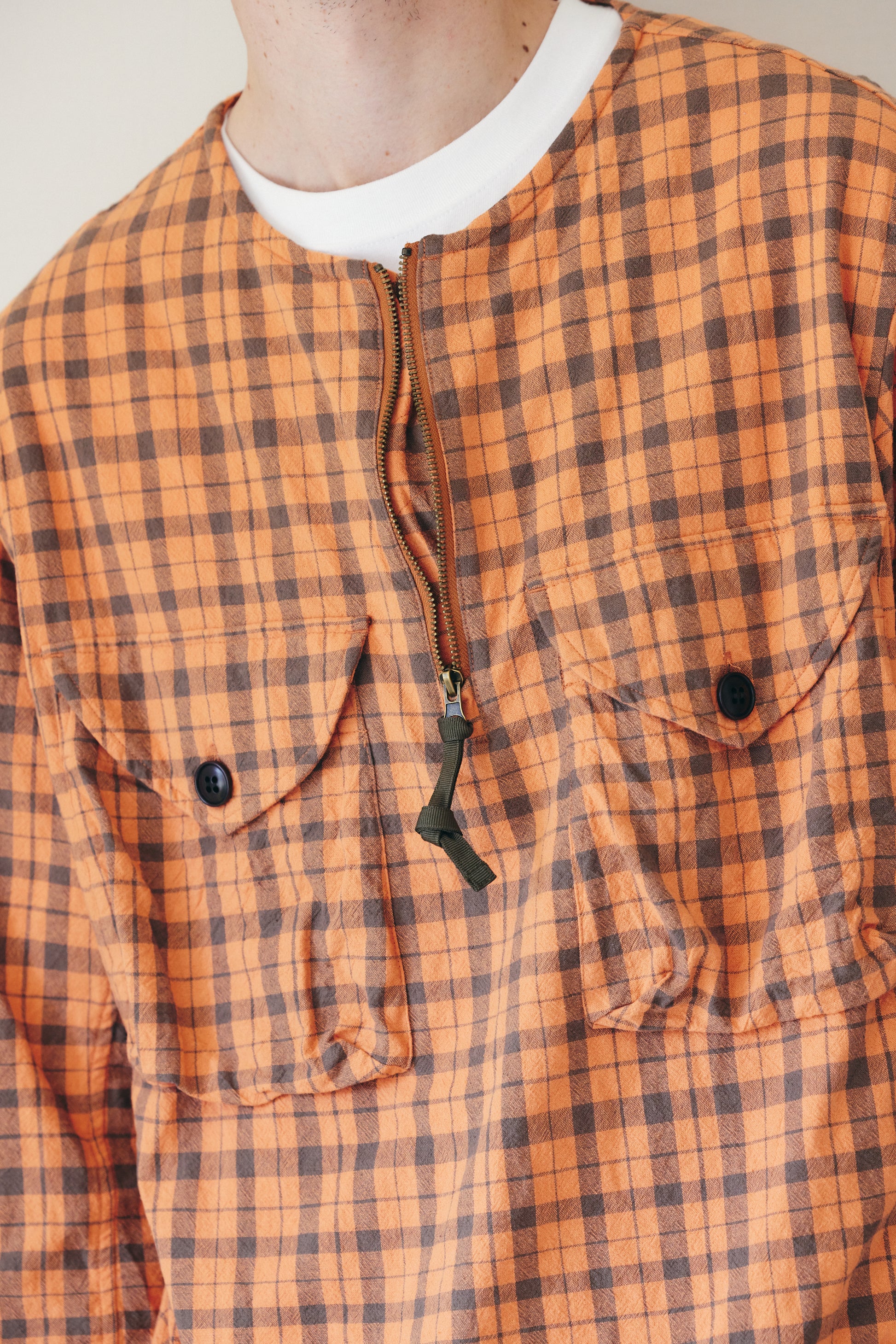 チェック柄のシャツ生地を使用した、プルオーバー仕様の一着です。チェストポケットにはシャツの要素を残しつつ、フロントにはジップを配し、デザインのアクセントにしました。シャツでありながら、アウター感覚でもコーディネートできるバランスに仕上げています。一枚での着用はもちろん、レイヤード時のインナーとしても使いやすいデザインです。裾にはポリテープのストリングスを配し、シルエット調整によってスタイリングの幅が広がります。