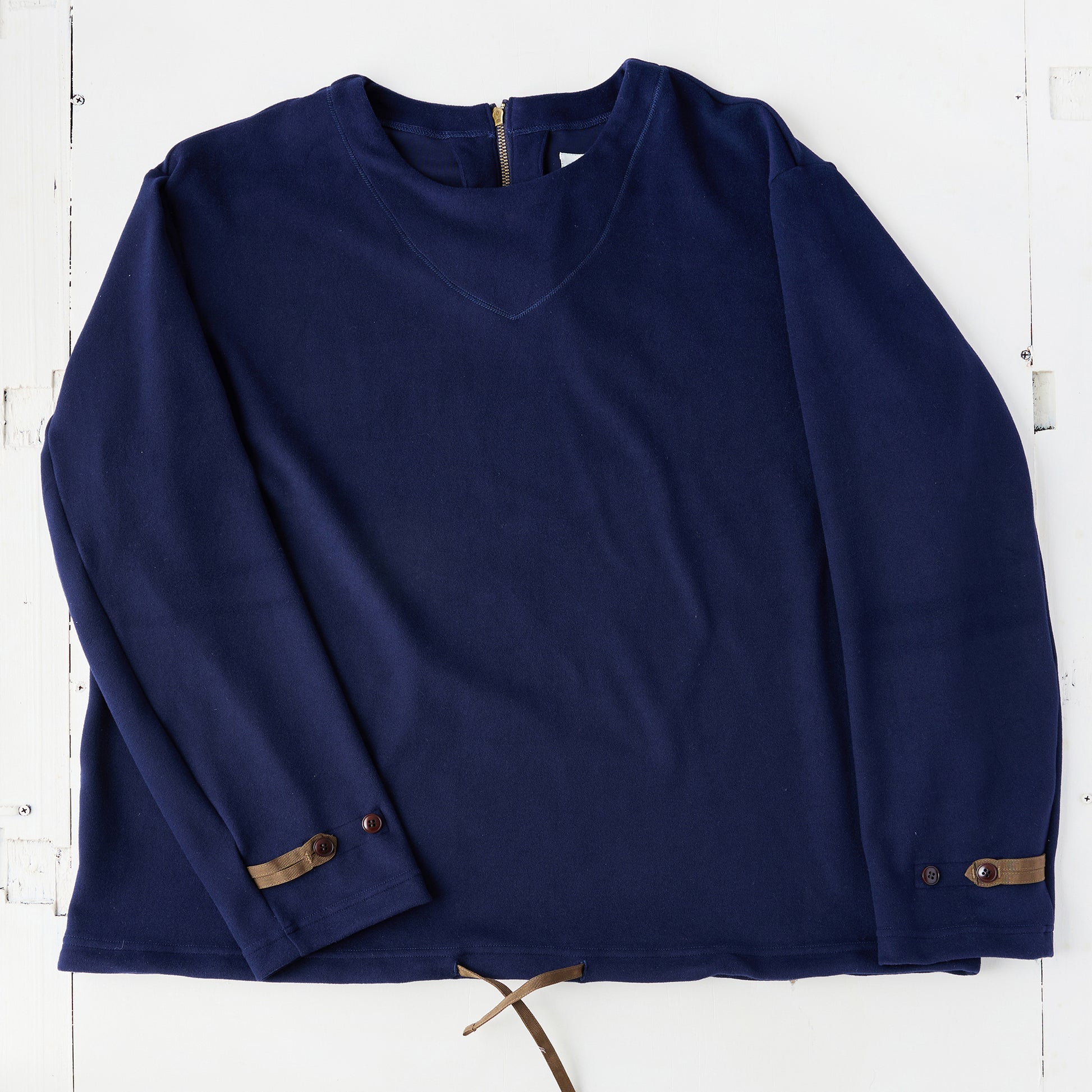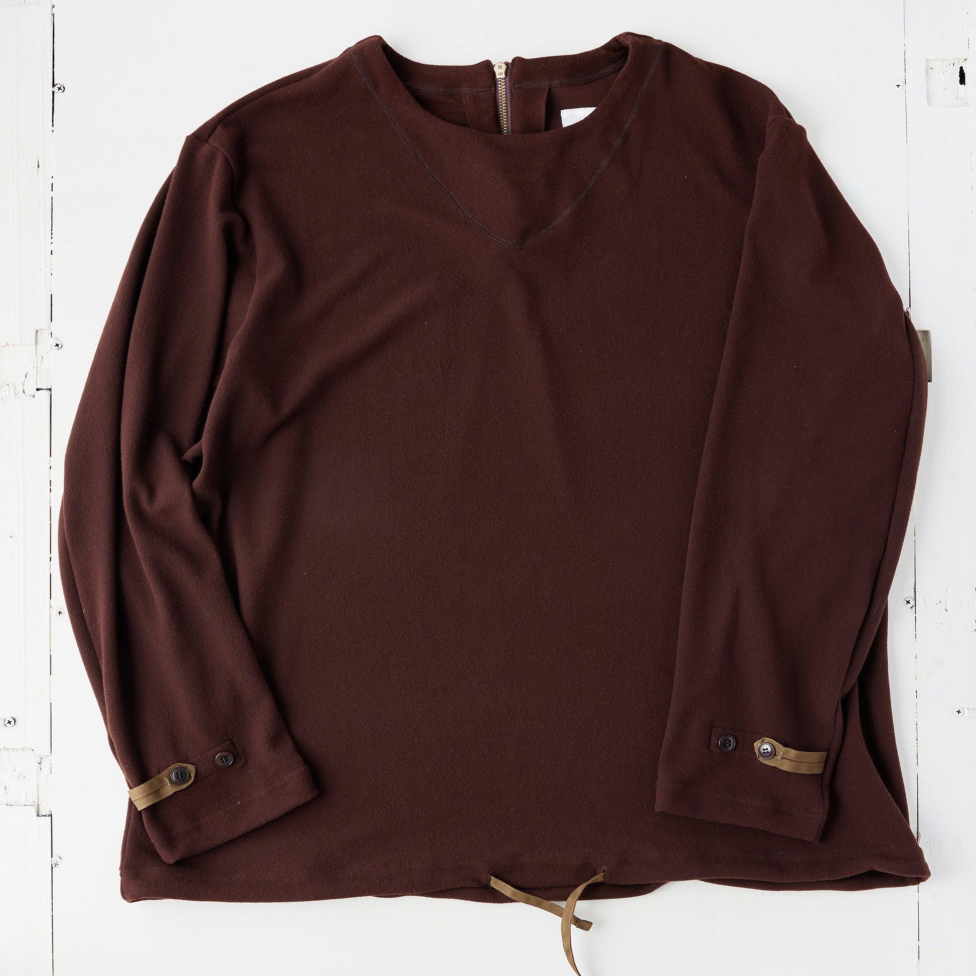 ストレッチ入りのフリース素材を使用し、布帛の縫製で仕上げたランドカラープルオーバーです。襟元のもたつきを無くす為にカラーレスにしました。普通のフリース素材とは違い、とても滑らかでくせになる触り心地です。後にはアクセントになるジッパーを。