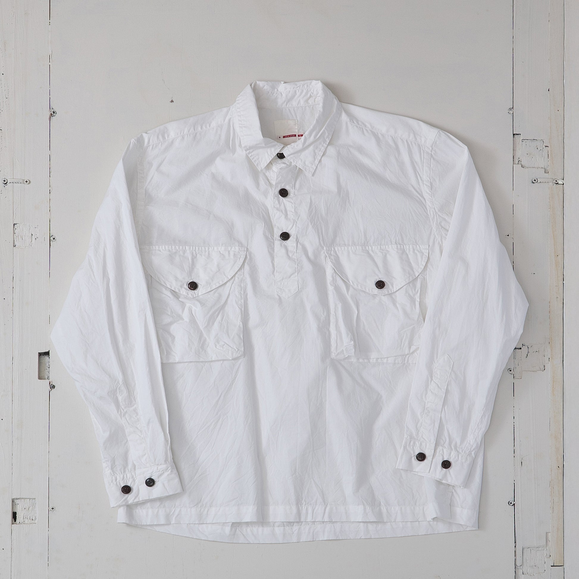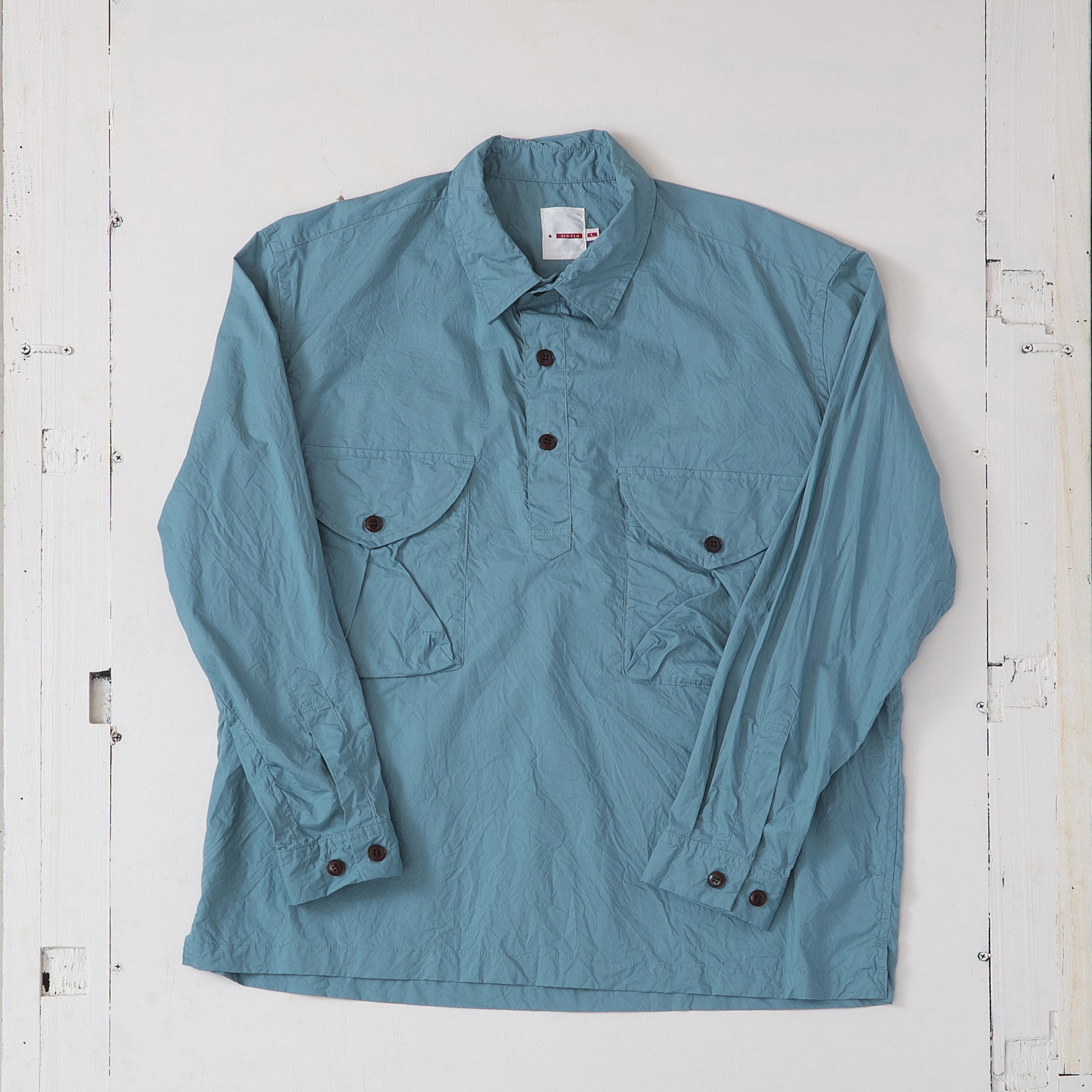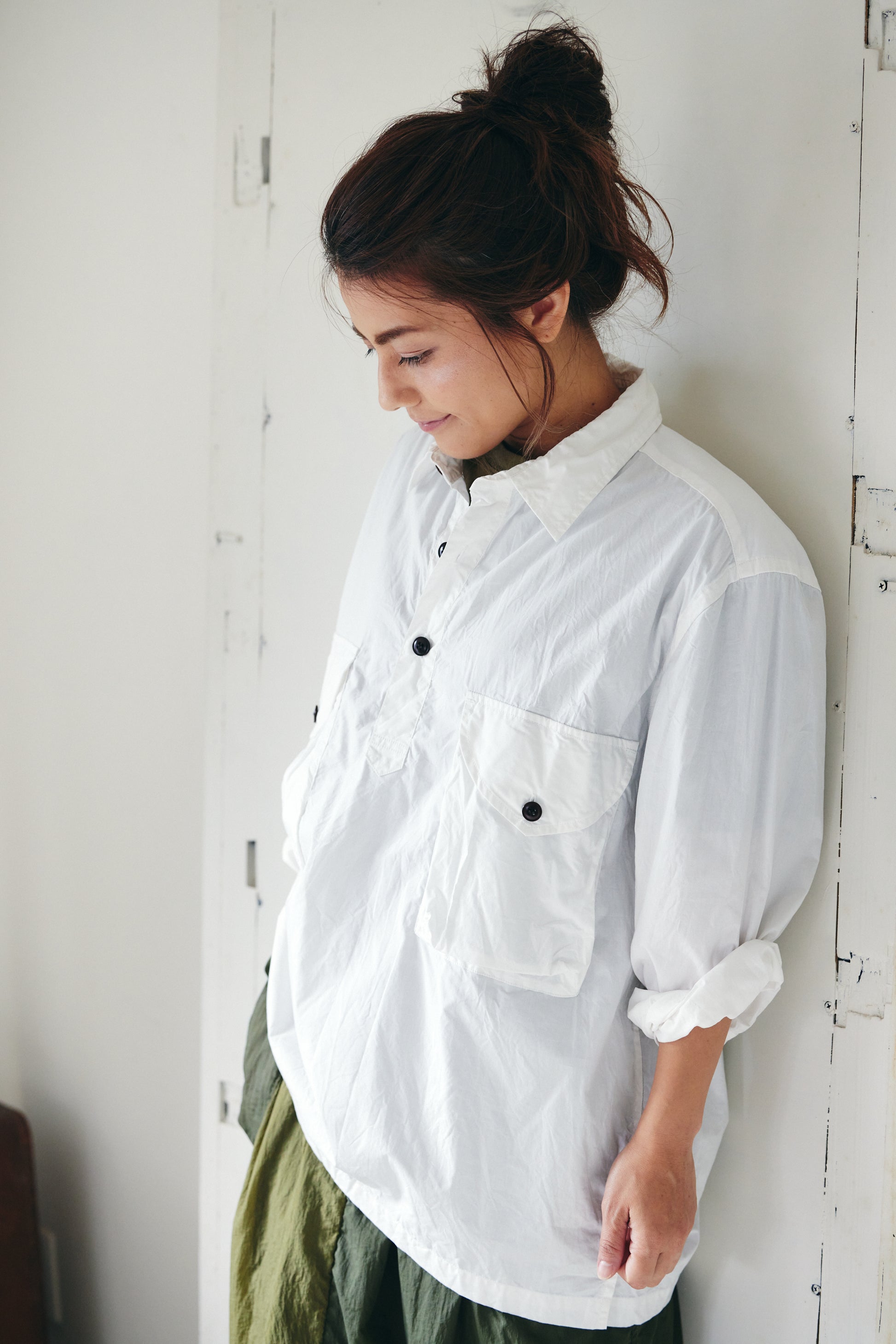 60番手の糸で織り上げたブロード生地を使用したプルオーバーシャツです。しなやかさと程よいハリを併せ持ち、軽やかな着心地に仕上げています。胸ポケットにはダーツを入れ、立体感のある表情とデザインのポイントに。ボタンには、色・形ともにdipオリジナルのコロゾ(木の実)ボタンを採用しています。着用と洗いを重ねることで、生地は次第にやわらかくなじみ、ブロード特有の表情が少しずつ深まっていきます。シンプルながら、長く付き合えるdipらしい一着です。